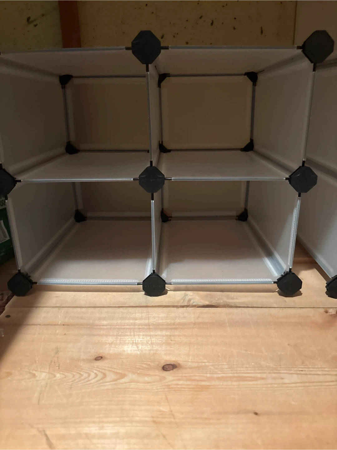 This is a modular cube storage unit with a white finish. It's made of plastic panels and connectors. It comes with multiple cubes that can be arranged in various configurations. Great for organizing small items!