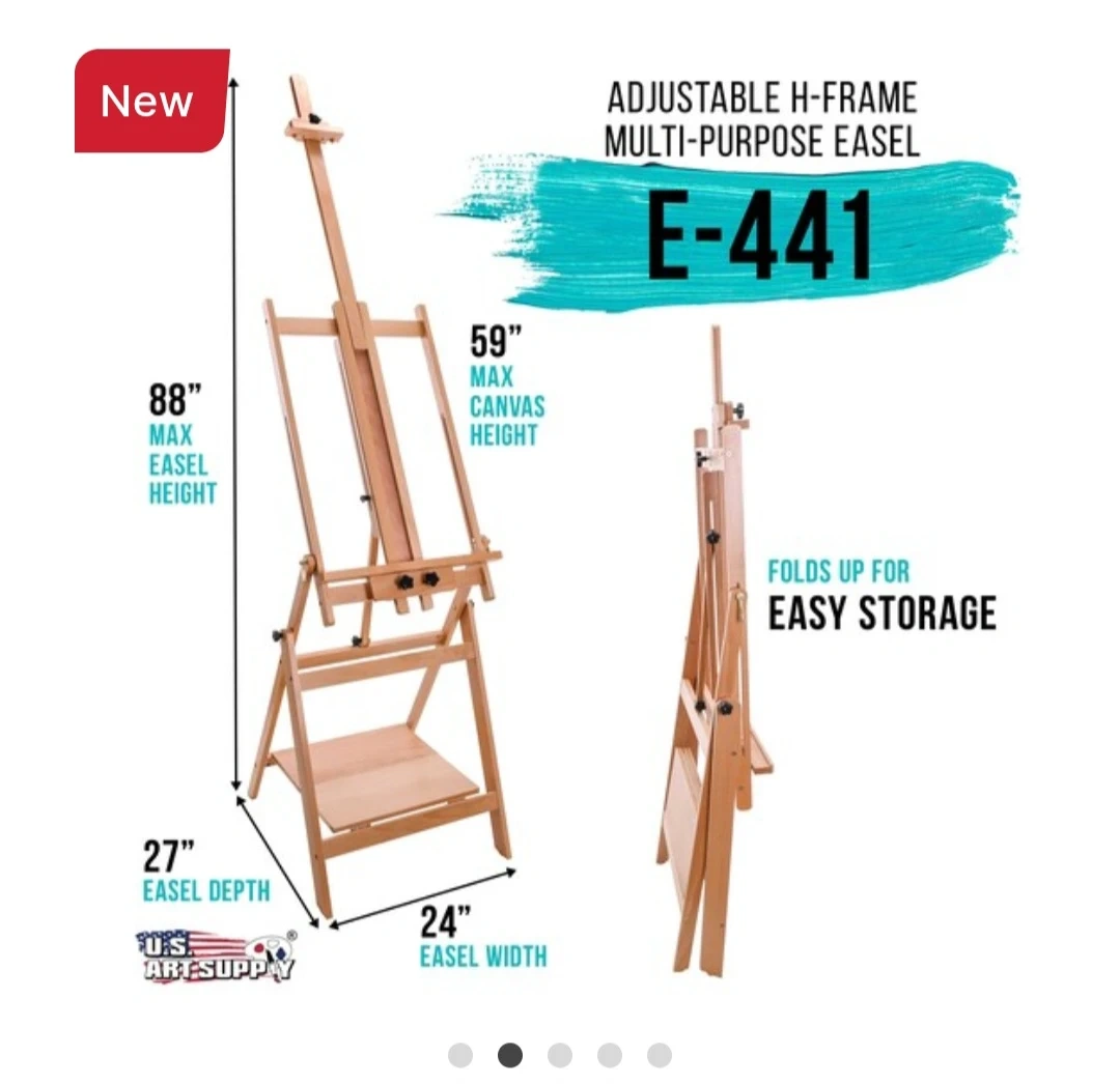 This large adjustable H-frame easel is designed for studio use. It can hold a maximum canvas height of 59 inches and has a maximum easel height of 88 inches. The easel folds up for easy storage.