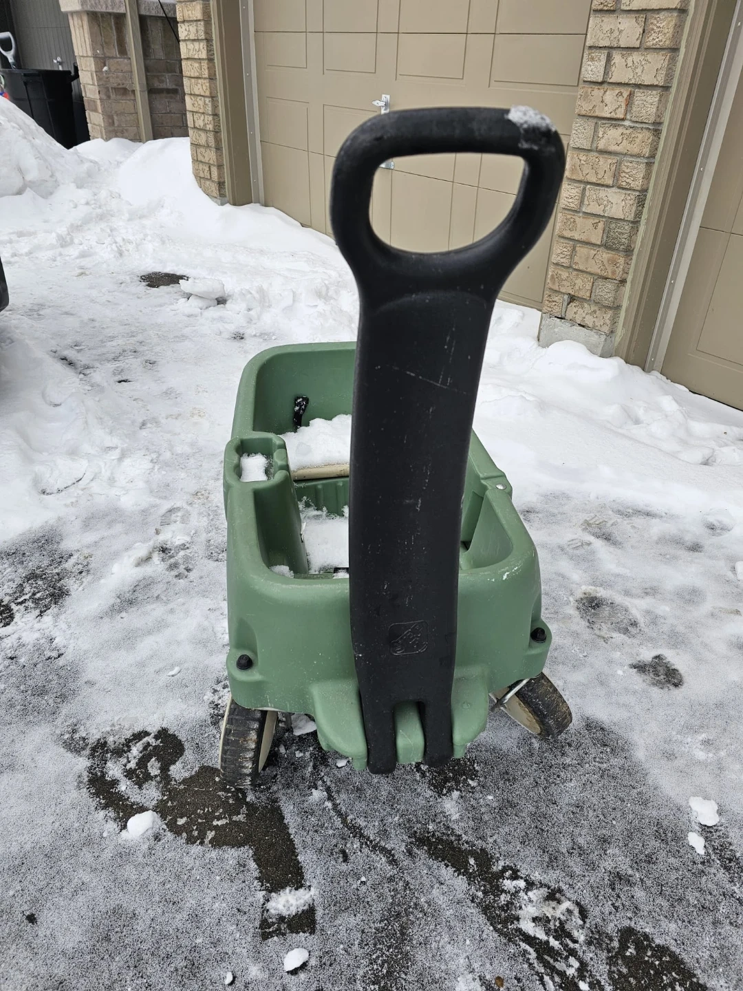 This is a green plastic wagon, perfect for hauling toys or gardening supplies. It features a sturdy handle for easy pulling. Its durable construction makes it great for outdoor play or yard work.