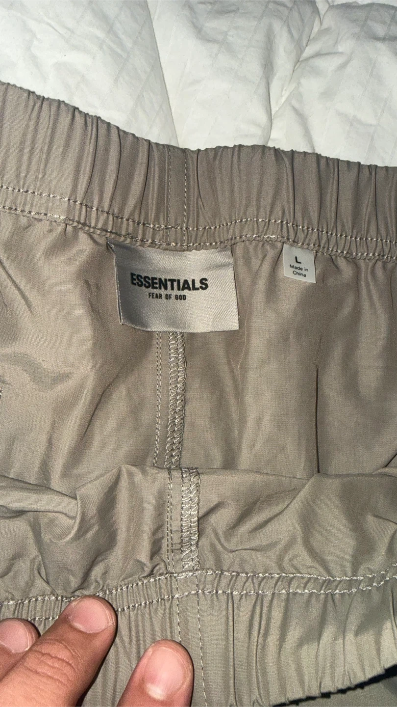 This is a set including a Fear of God Essentials jacket and pants. The jacket is olive green with a quarter-zip closure and the pants are taupe with an elastic waistband and drawstring. Jacket is a size XL and Pants are a Large