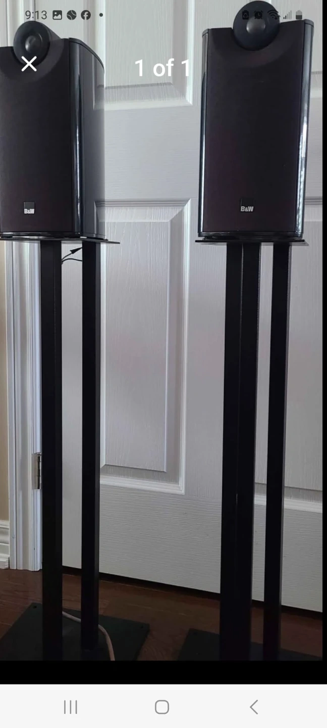 A pair of black B&W speakers are shown on black stands. These speakers look like they could be a great addition to your home audio setup. The stands are made of metal and are designed to hold the speakers securely.