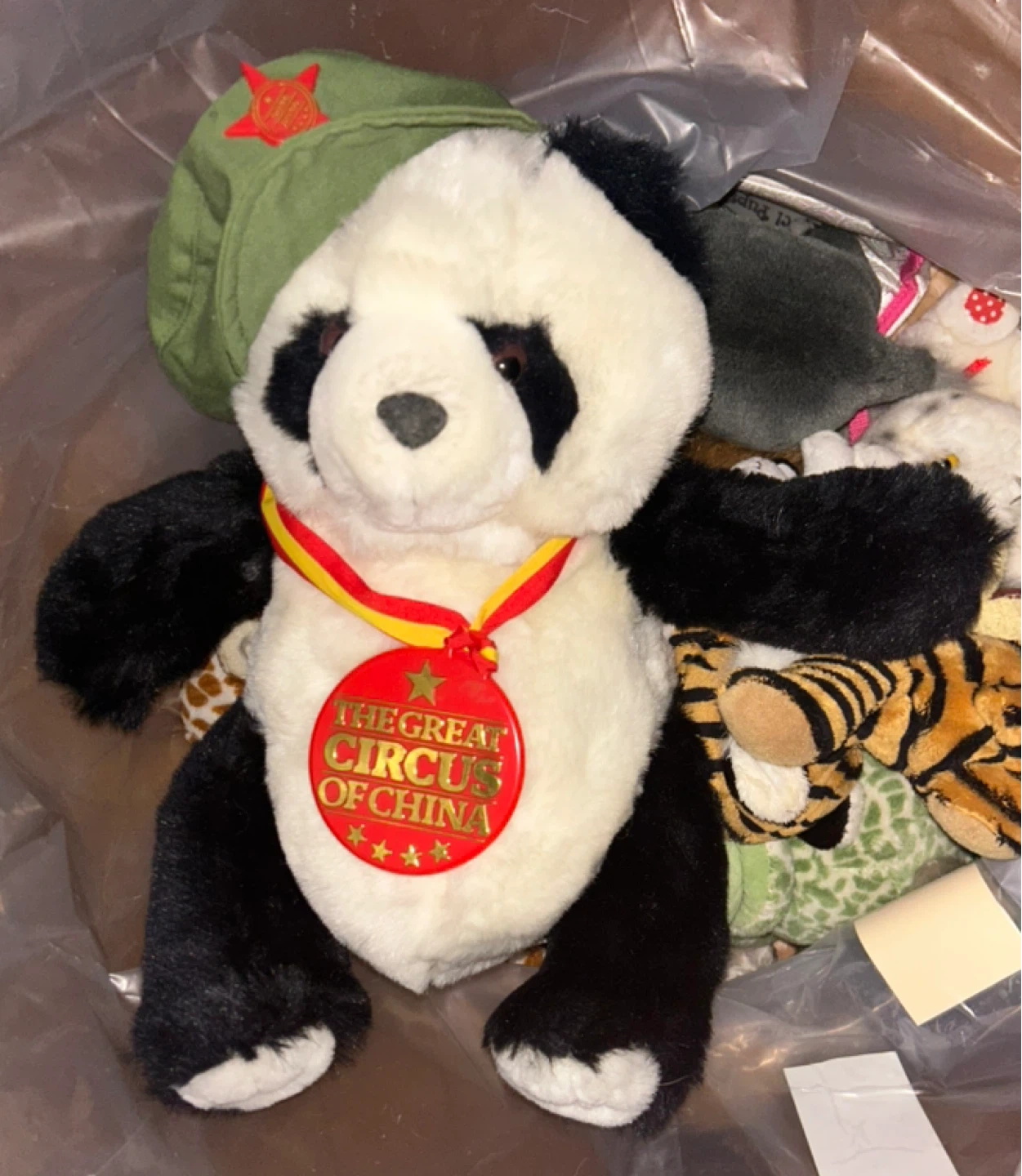 GongGong Plush panda wearing a green hat and a red and yellow medal. The medal reads 'The Great Circus of China'. It's a soft, stuffed toy from their 1990 tour of Canada.