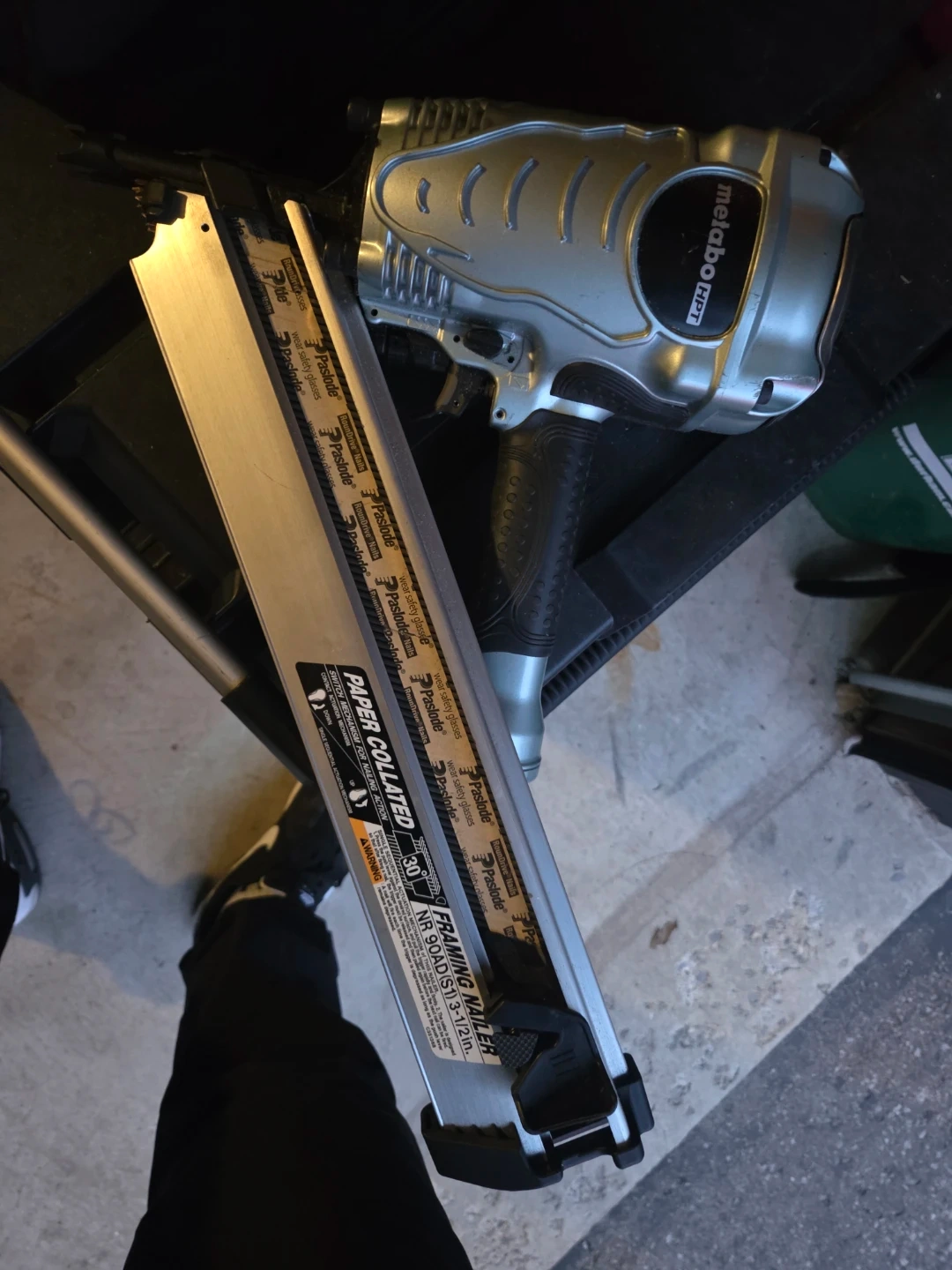 Metabo HPT paper collated framing nailer, model NR 90AD(S1). It takes 3-1/2 inch nails. Features a switch mechanism for nailing action and contact actuation. Great for framing jobs!