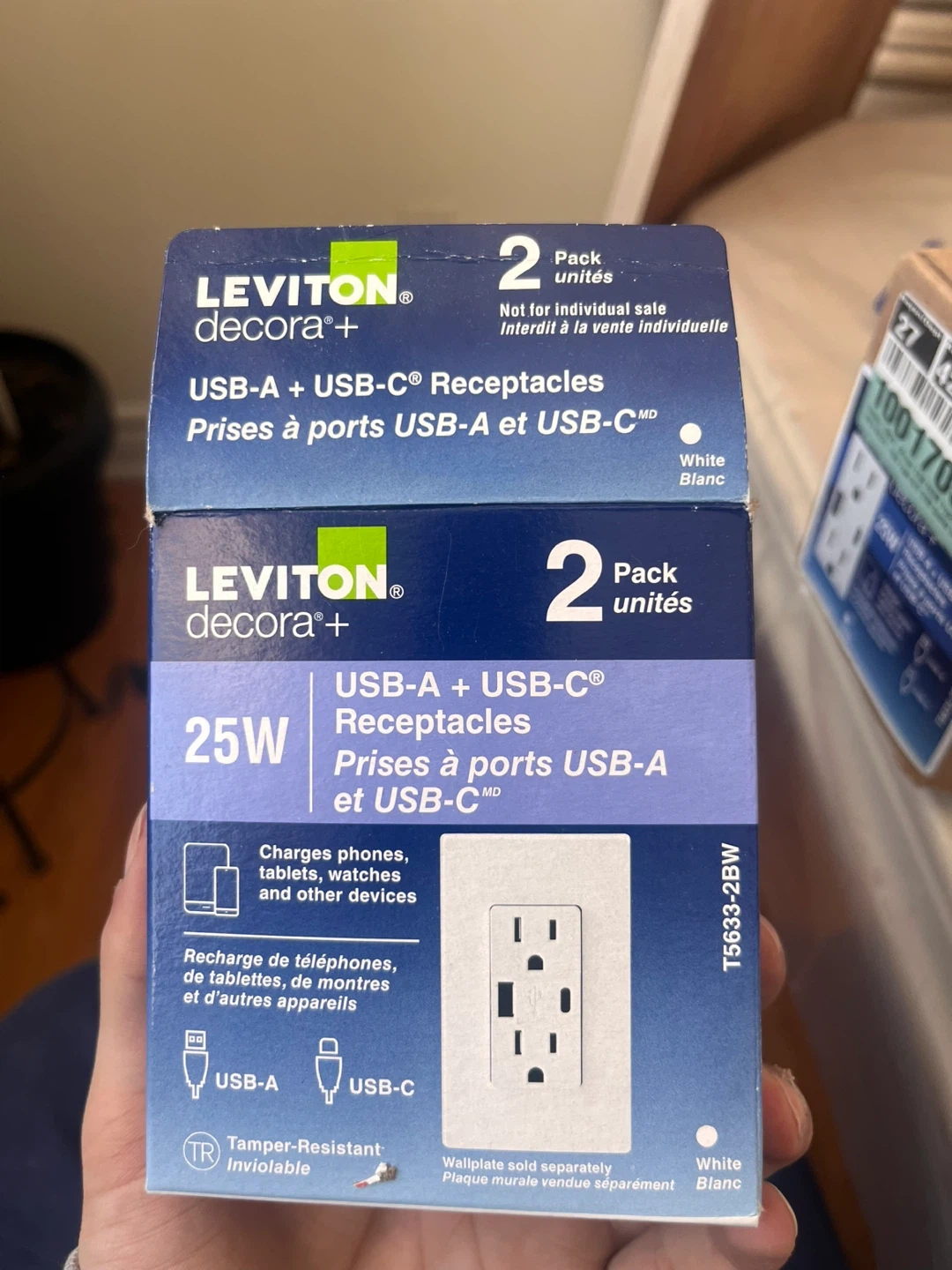 Leviton Decora+ USB-A and USB-C receptacles in white. Charges phones, tablets, watches, and other devices. Rated for 5.1A (25W) USB charging. Tamper-resistant design.