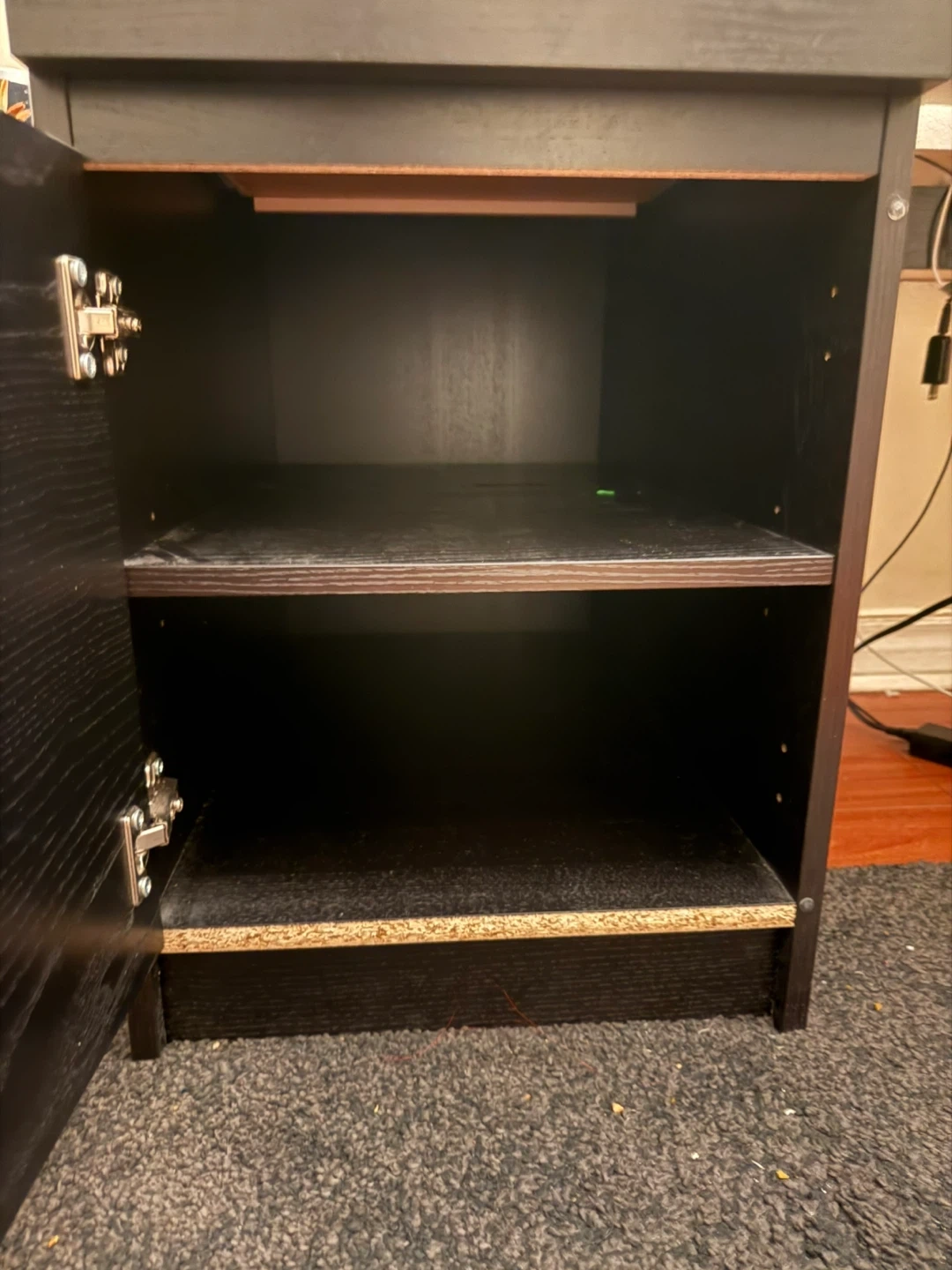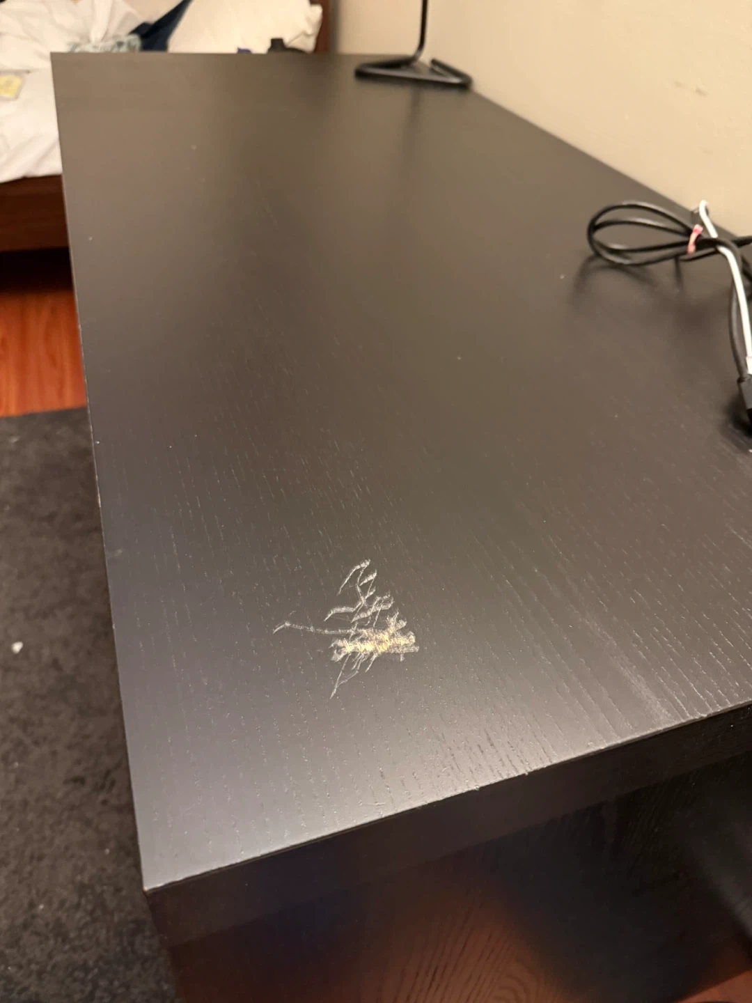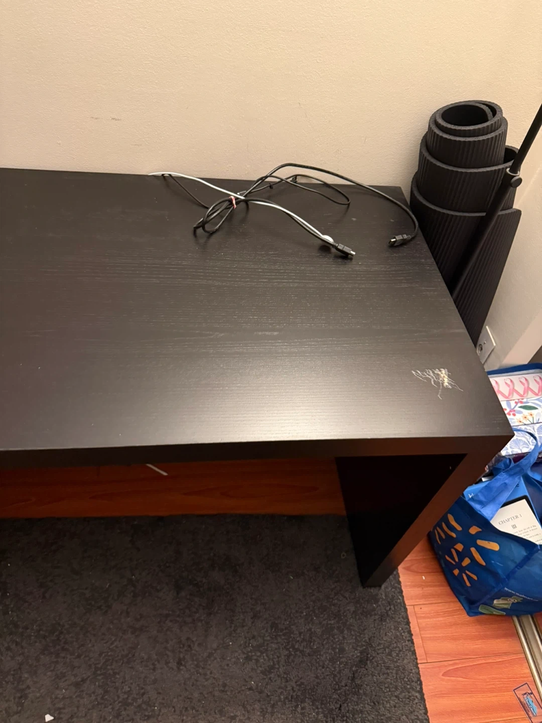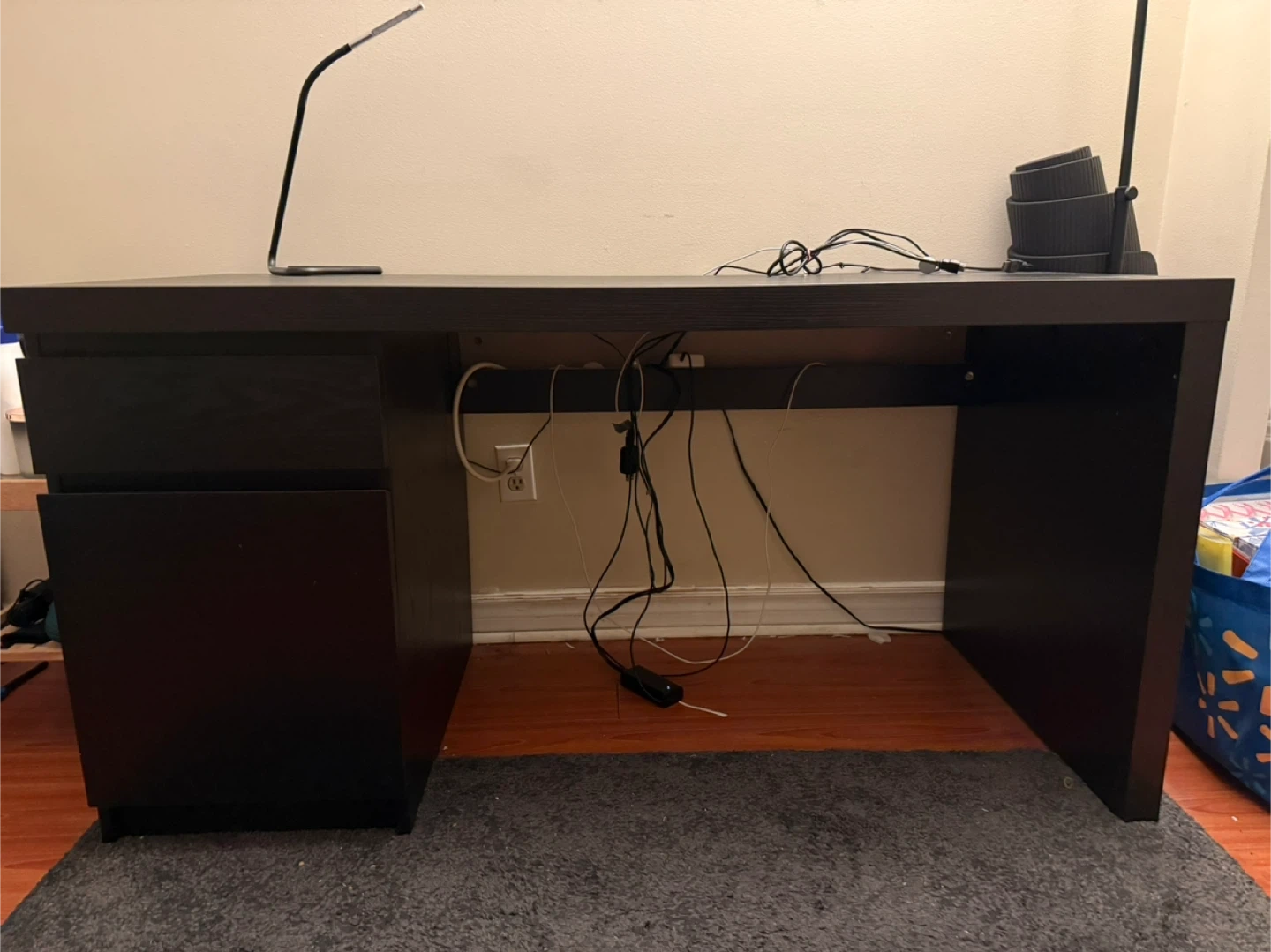 IKEA malm Dark brown desk with two drawers on the left side. Wood-grain finish. There is some visible scratches but can usually be hidden with a keyboard mat.
