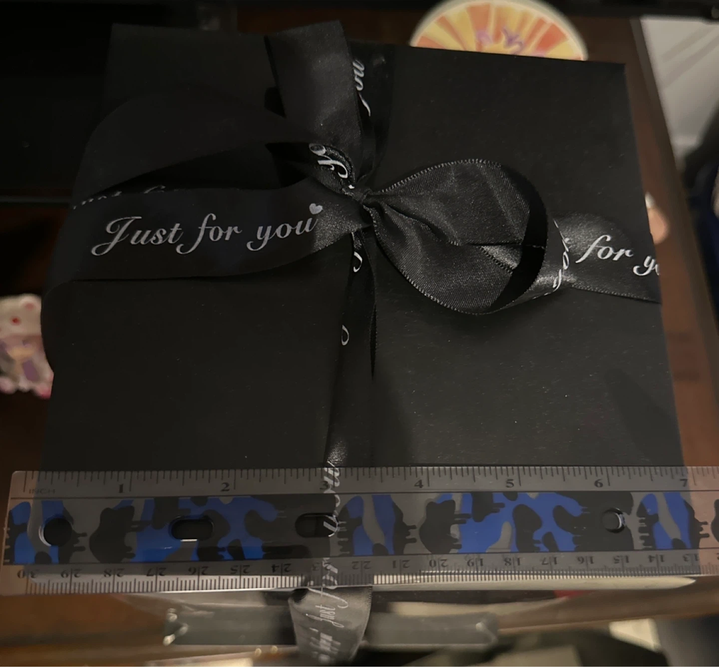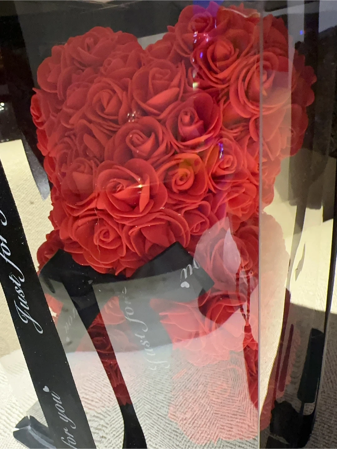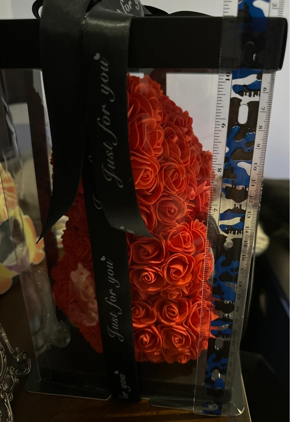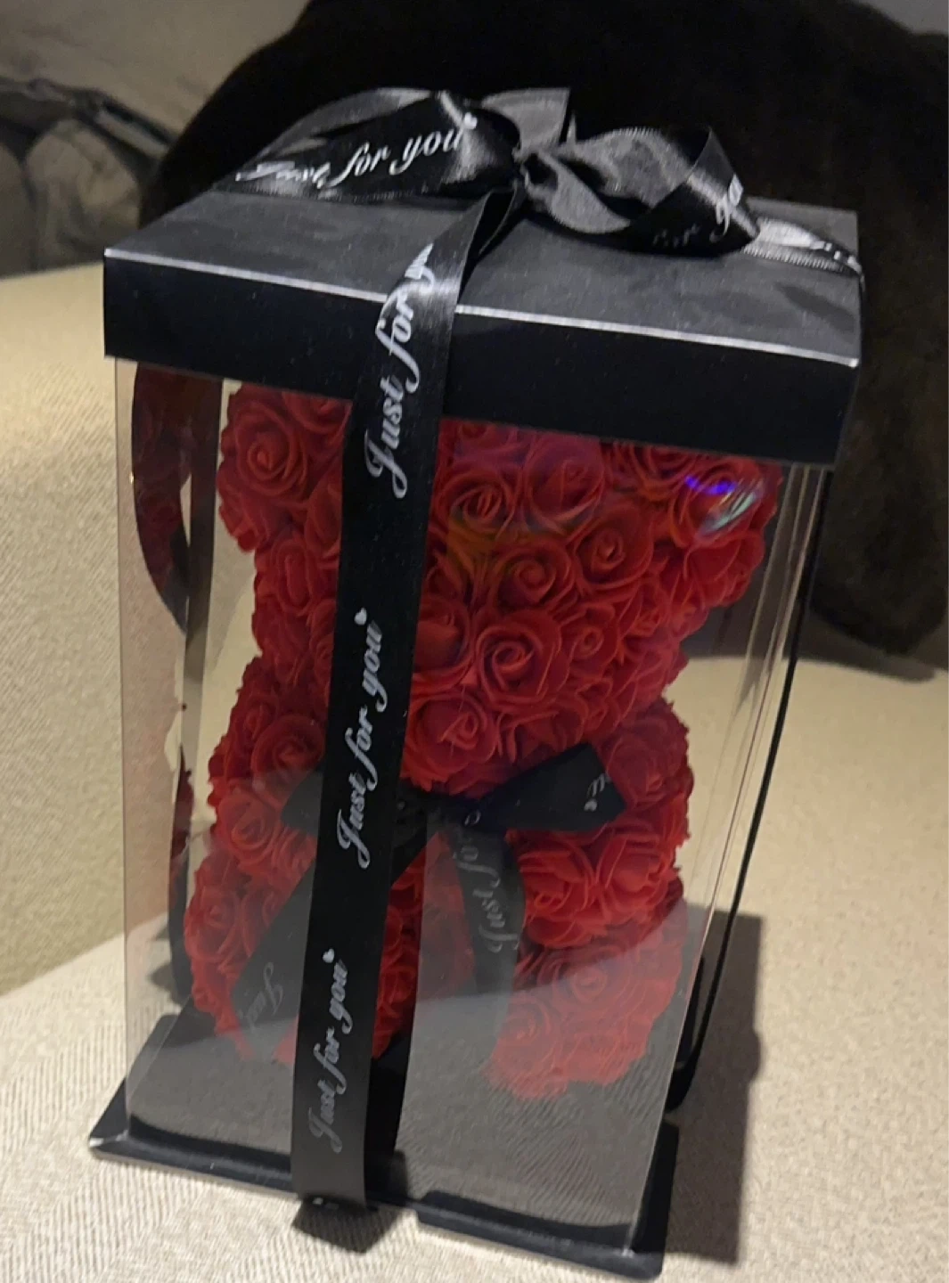 This is a red rose bear in a clear gift box. It's finished with a black ribbon that says "Just for you". Around 7 inches wide and 11 inches tall perfect gift for last minute of Valentine’s Day.