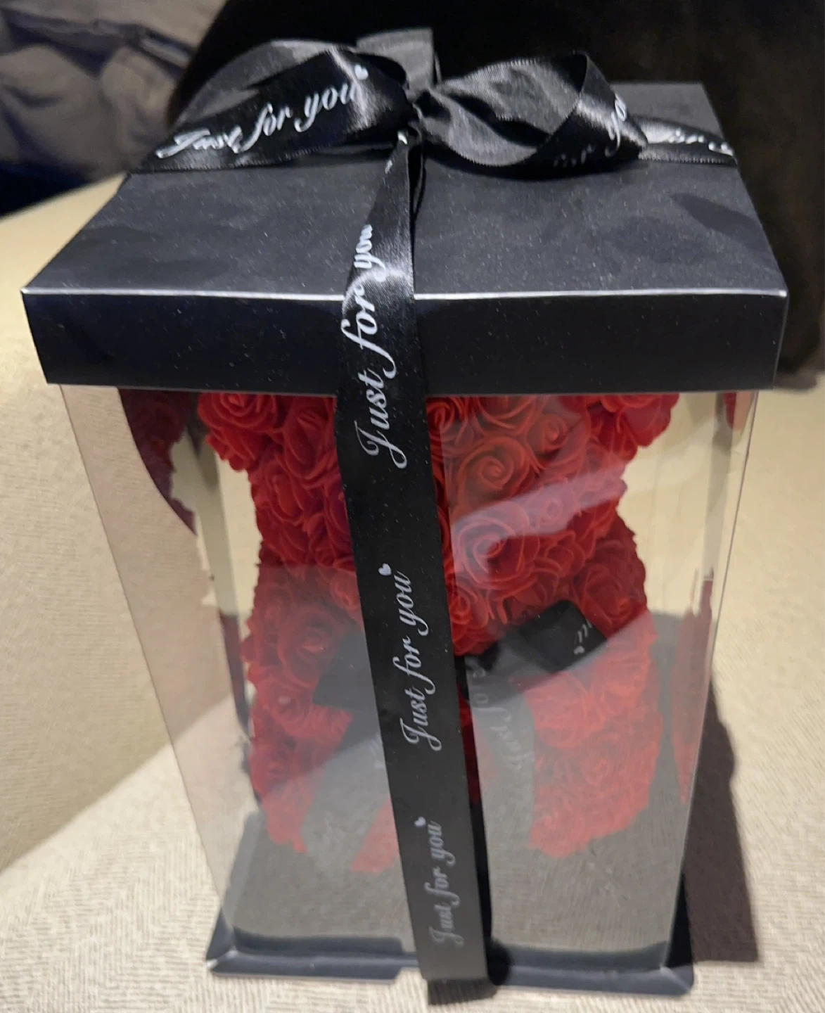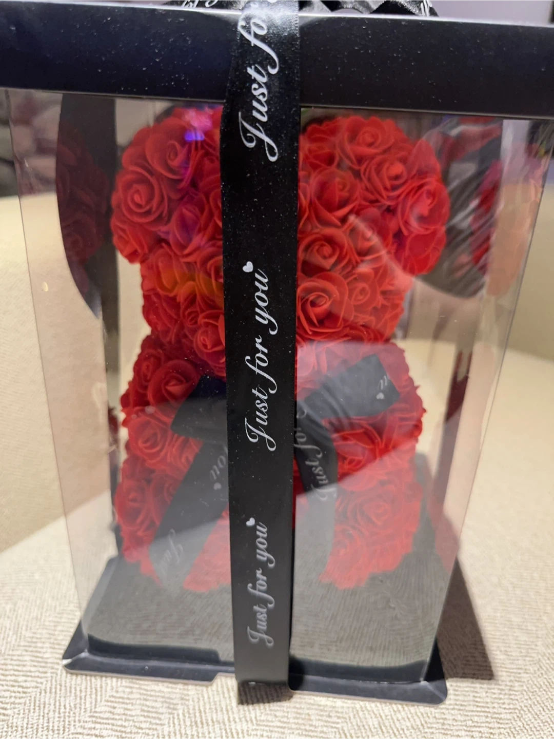 This is a red rose bear in a clear gift box. It's finished with a black ribbon that says "Just for you". Around 7 inches wide and 11 inches tall perfect gift for last minute of Valentine’s Day.