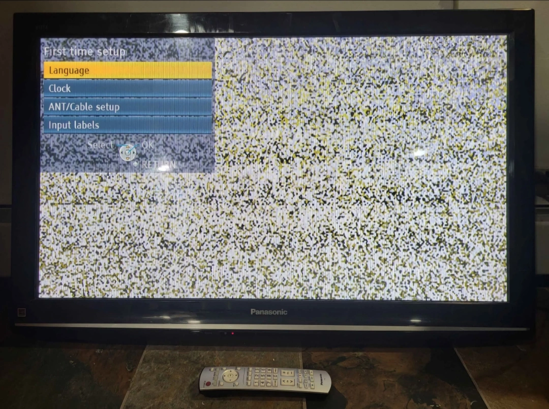 Panasonic 42 inch plasma HDTV. Model TC-P42X1. Manufactured June 2009. Includes remote. Screen shows static; sold as-is for parts or repair.