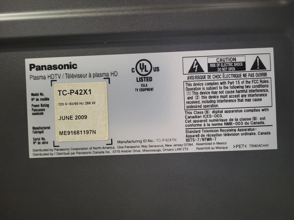 Panasonic TC-P42X1 42-inch Plasma HDTV - For Parts or Repair
