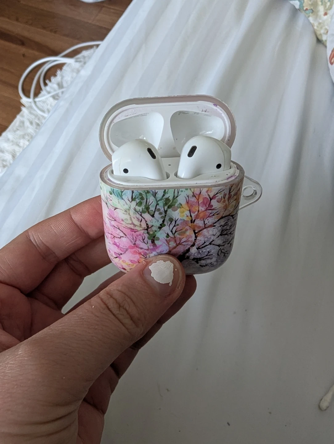Apple AirPods in a charging case. It comes with a charging cord but no case. Will clean more before selling