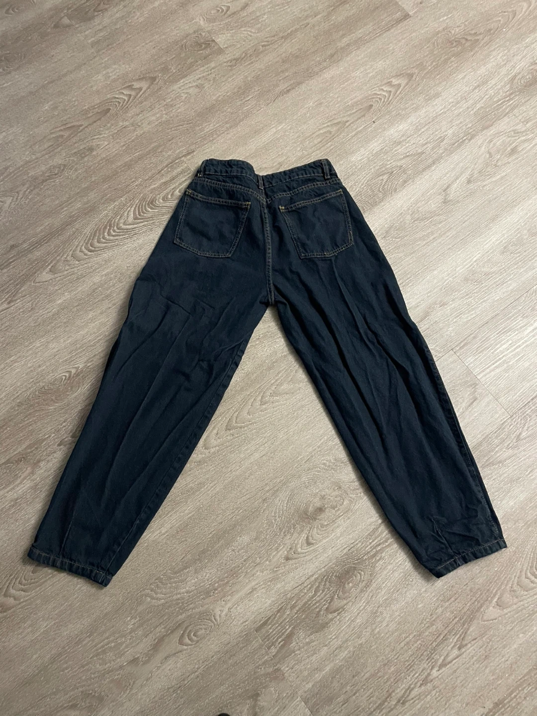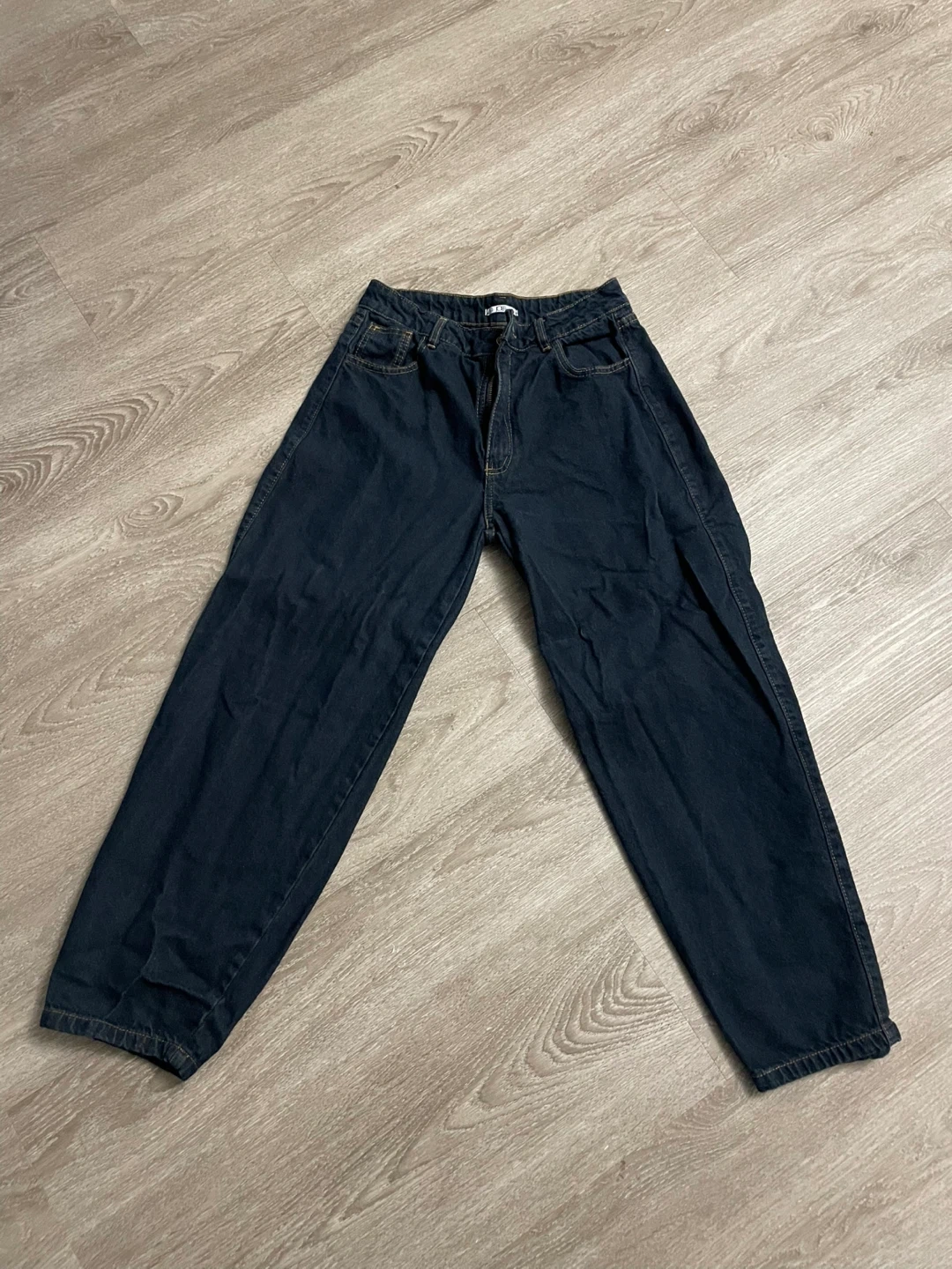 These dark wash jeans have a relaxed fit with a wide leg opening. Made from durable denim, they're perfect for everyday wear. The classic five-pocket design offers plenty of storage.