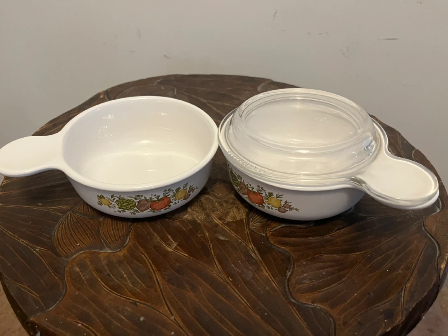 This CorningWare casserole dish features the charming Vegetable Medley pattern. It includes a clear glass lid for convenient storage. Dish is approximately 6 inches in diameter. Perfect for serving or reheating small portions!