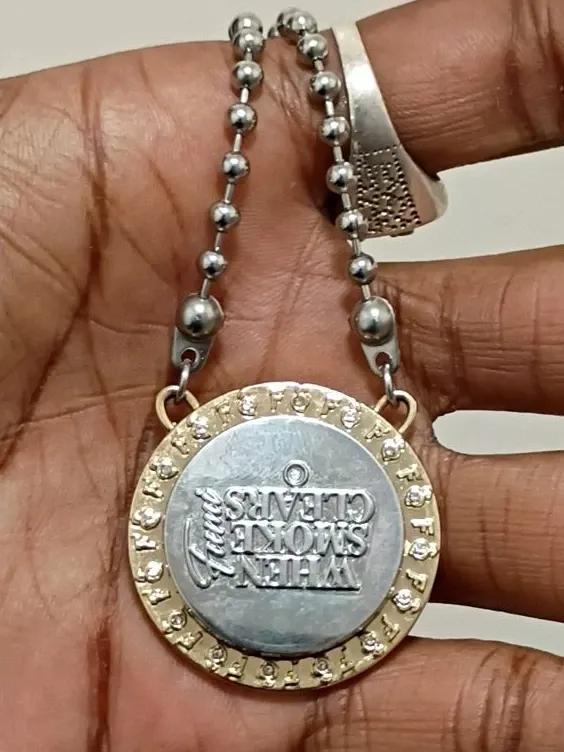 This pendant necklace features the 'When Smoke Clears' slogan. It's made with metal and hangs from a silver-tone ball chain. The pendant has a circular design with textured detailing around the edge.