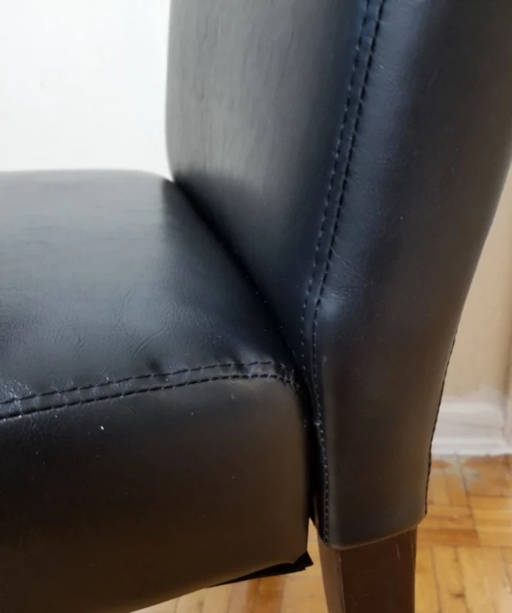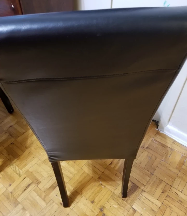 This black faux leather dining chair offers a sleek look for your dining space. The chair features a comfortable seat and back with stitched detailing. Its dark wooden legs provide sturdy support.