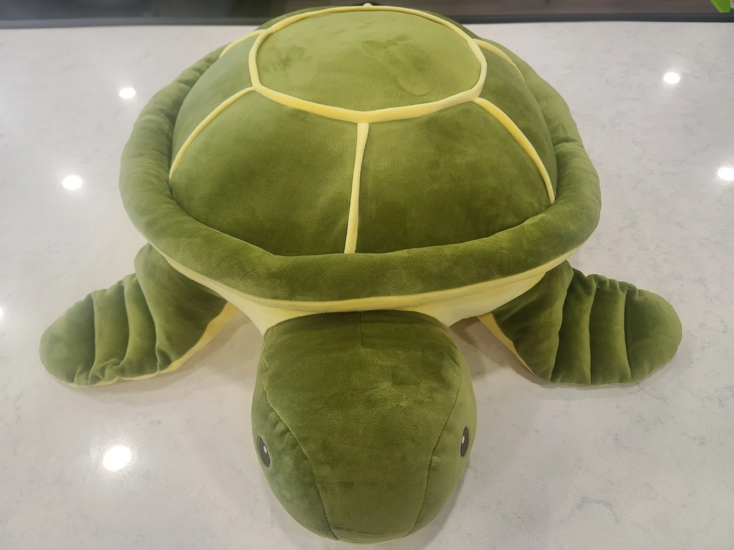 This is a plush, green turtle pillow in good condition. It would be a great addition to any child's room or as a fun decorative piece for turtle enthusiasts of any age. If the ad is up, the turtle is still available.