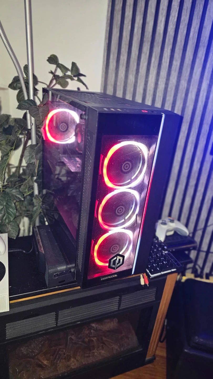 Selling a custom-built gaming PC featuring a Deepcool case and CyberpowerPC components! The case has cool red LED fans. I The back panel has multiple ports for connectivity.