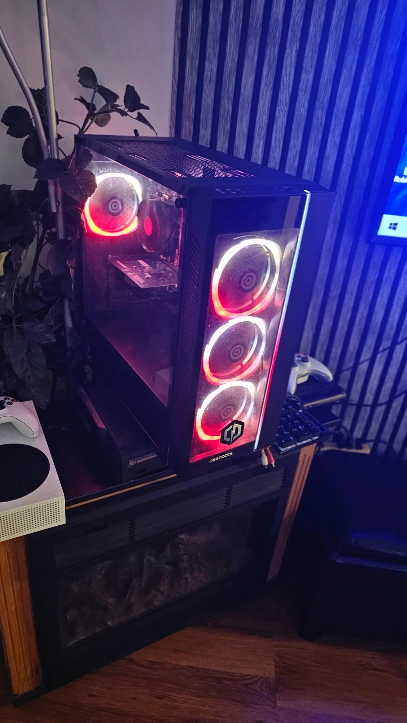 Selling a custom-built gaming PC featuring a Deepcool case and CyberpowerPC components! The case has cool red LED fans. I The back panel has multiple ports for connectivity.
