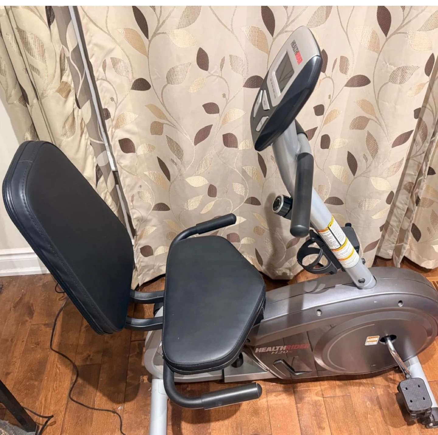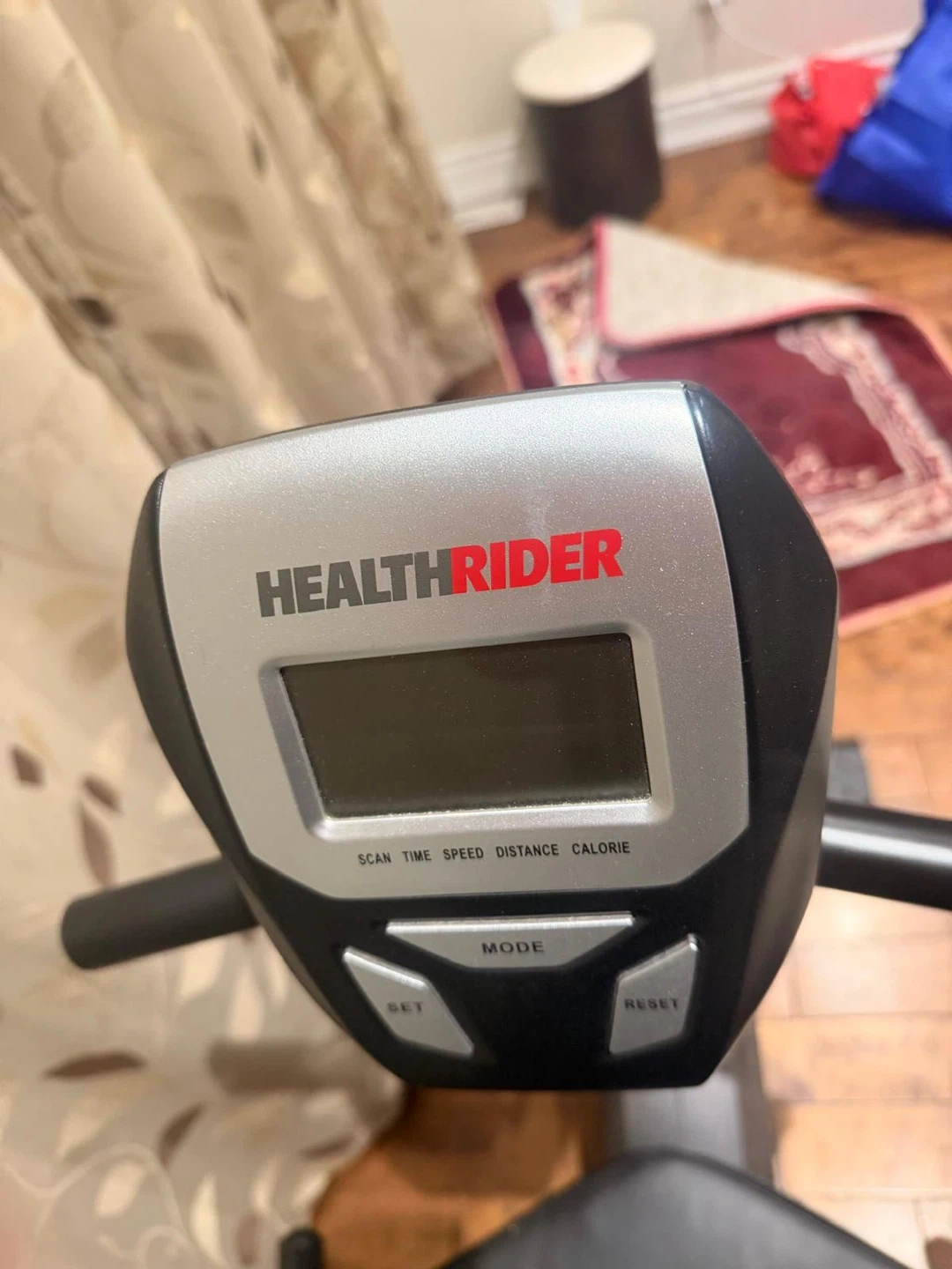 HealthRider recumbent exercise bike with digital display. Shows scan, time, speed, distance, and calories. It has adjustable seat and pedals. Great for at-home workouts!
