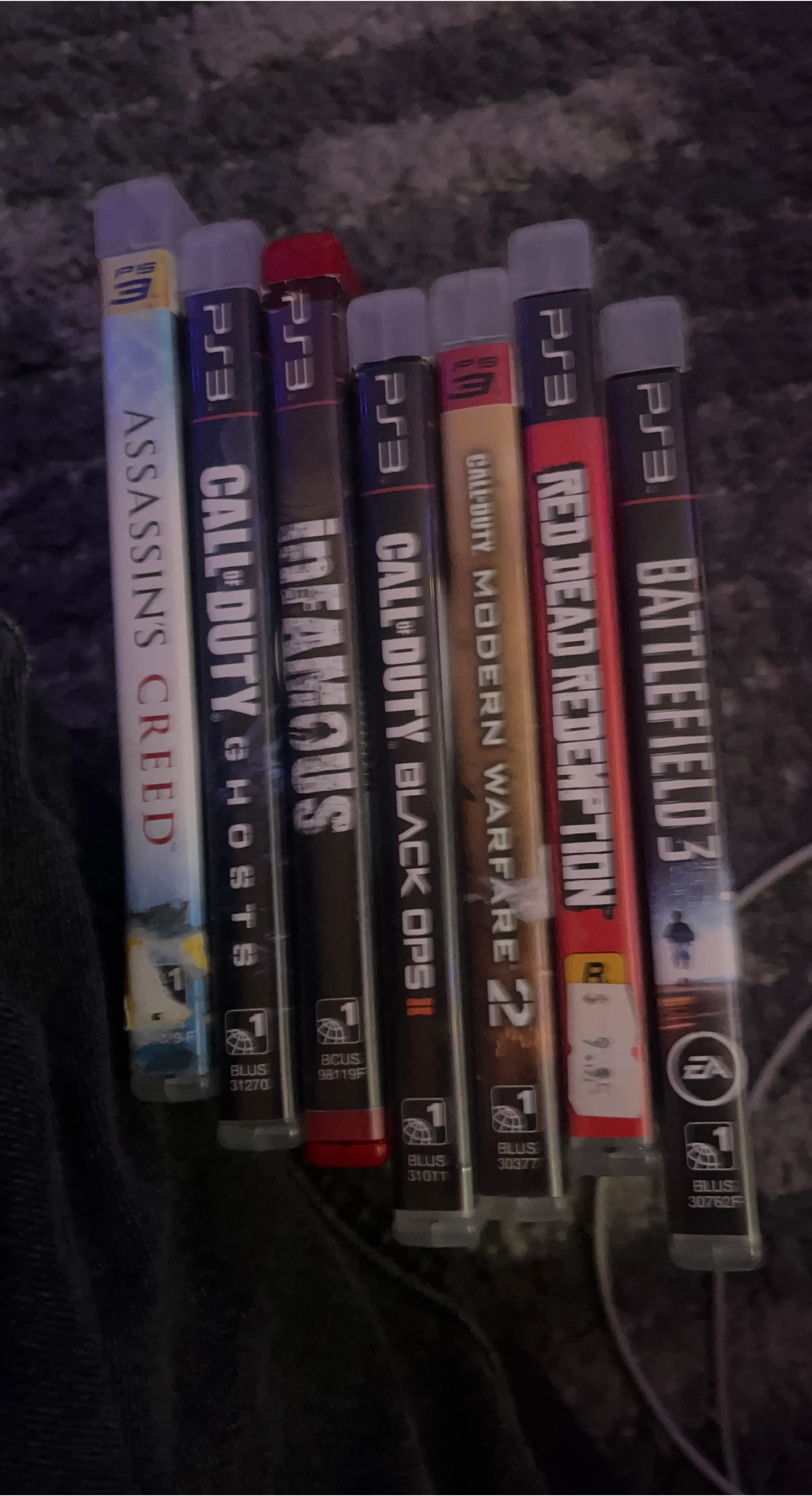 Bundle of seven PlayStation 3 video games including Assassin's Creed, Call of Duty: Ghosts, inFAMOUS, Call of Duty: Black Ops II, Call of Duty: Modern Warfare 2, Red Dead Redemption, and Battlefield 3. These are discs only, no boxes included.