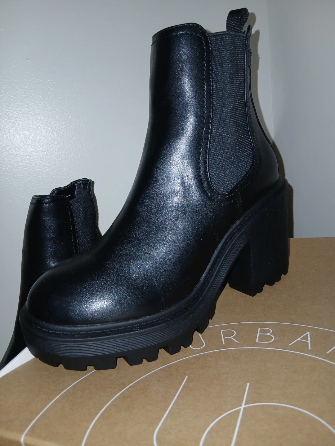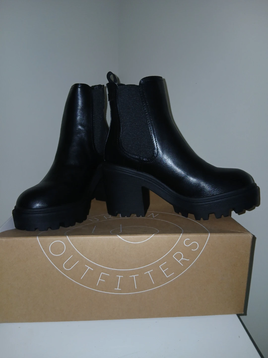 Black faux leather Chelsea boots with a block heel and lug sole. They're a size 8, but fit a little tight, so I think it's safe to size down. New & Includes original box.