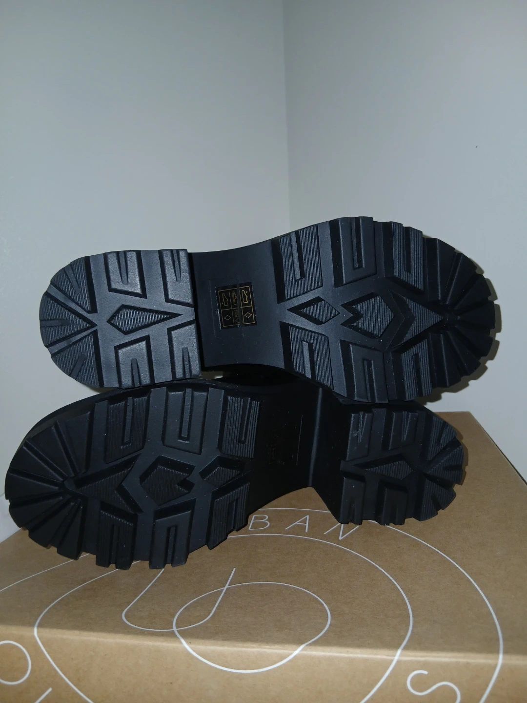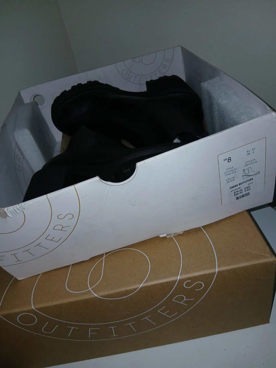 Black faux leather Chelsea boots with a block heel and lug sole. They're a size 8, but fit a little tight, so I think it's safe to size down. New & Includes original box.