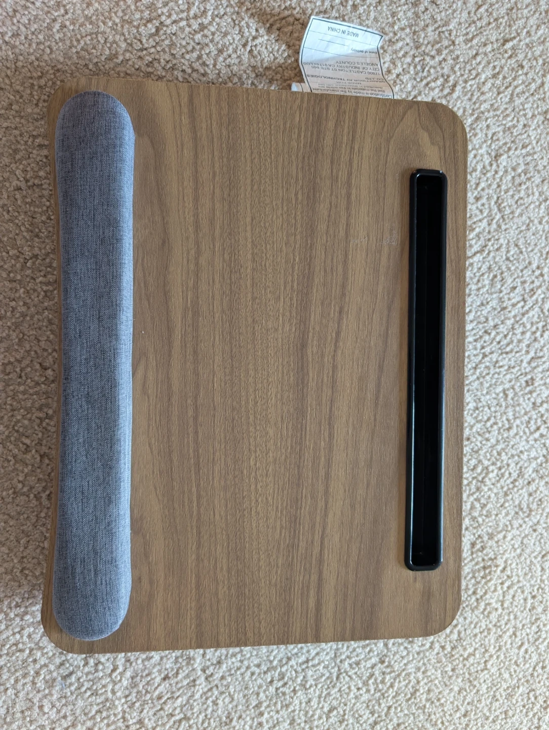 This portable lap desk features a wooden surface and a padded wrist rest for comfort. It's designed for use with laptops, providing a stable surface. Great for working or browsing on the go!