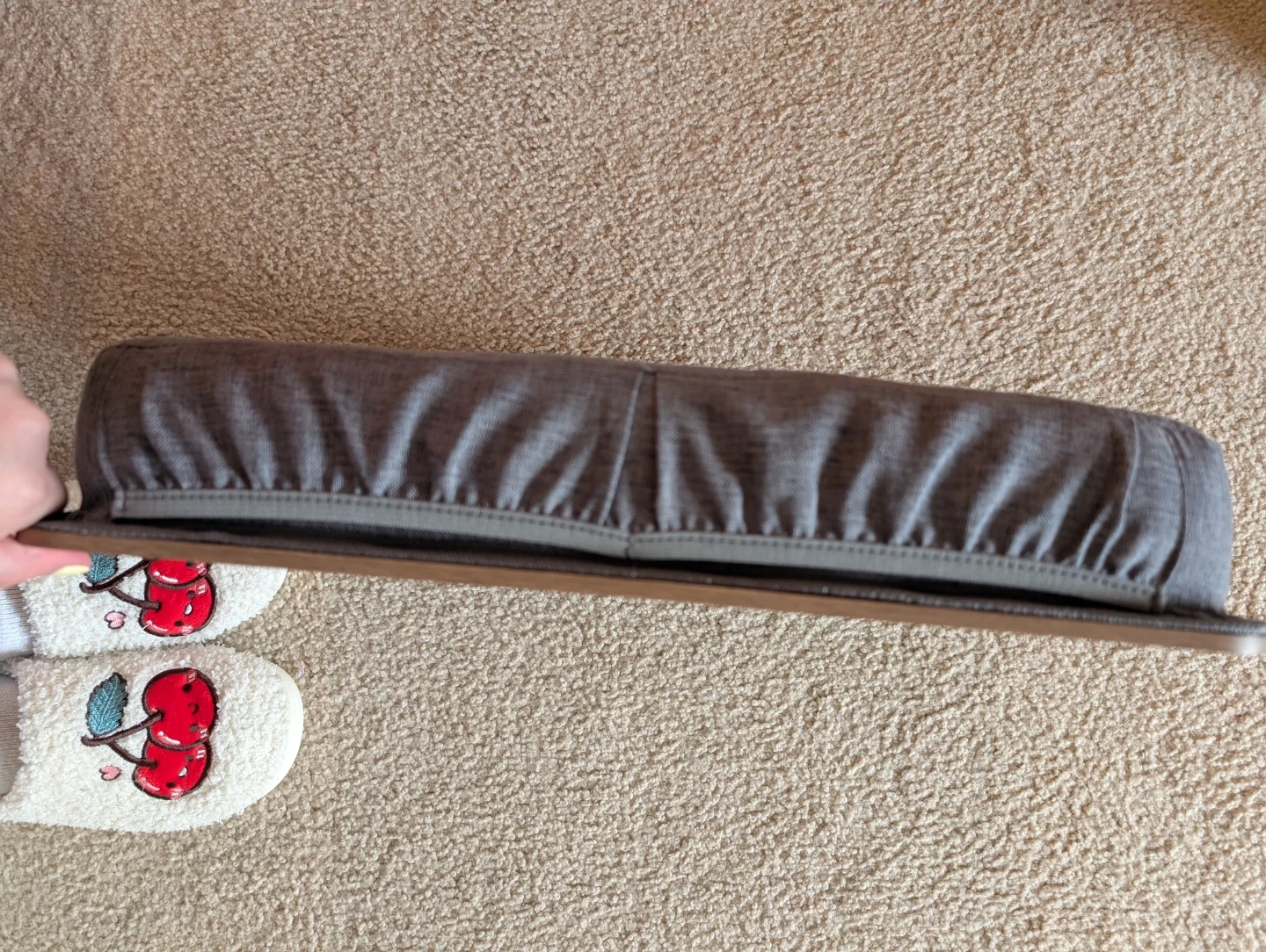 This portable lap desk features a wooden surface and a padded wrist rest for comfort. It's designed for use with laptops, providing a stable surface. Great for working or browsing on the go!