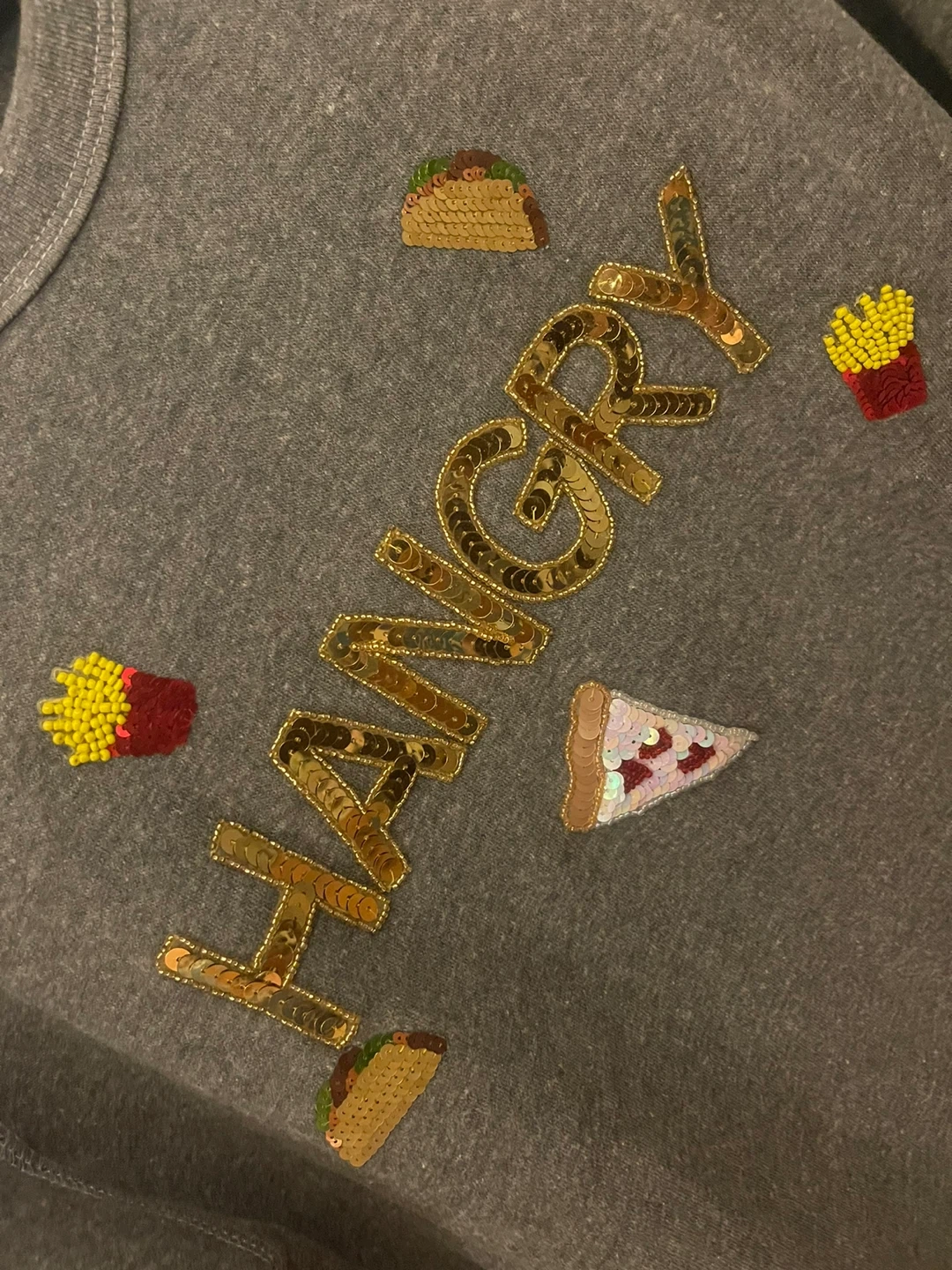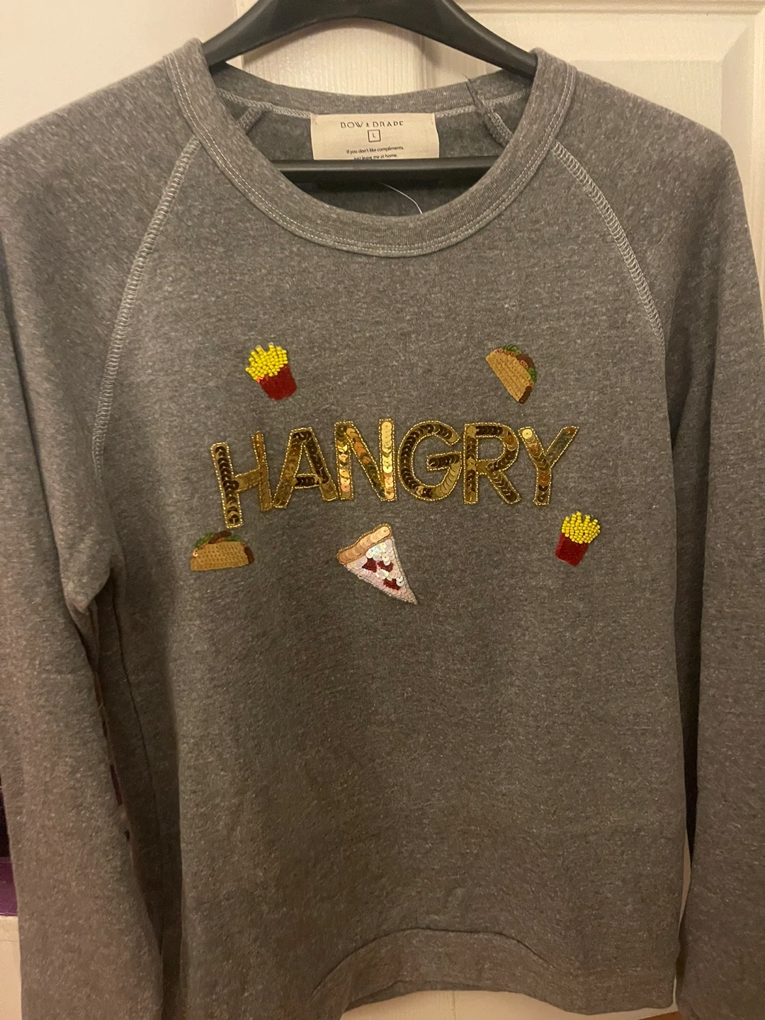 Cozy Bow & Drape sweatshirt in a size large! It's a grey colour with fun sequin and beaded food appliques and the word "Hangry" across the front. Perfect for a casual, comfy look!