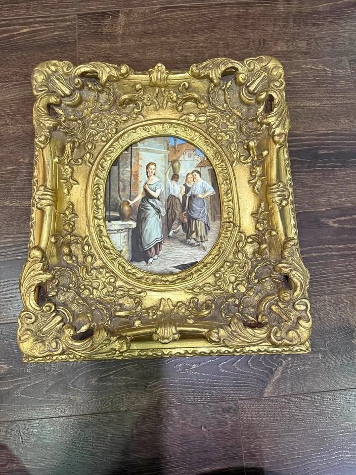 Beautiful vintage framed reproduction in the style of the French School, featuring women gathering at a well in a charming village scene. Rich colours, detailed brushwork, and an extremely ornate baroque-style gold frame make this a striking décor piece.