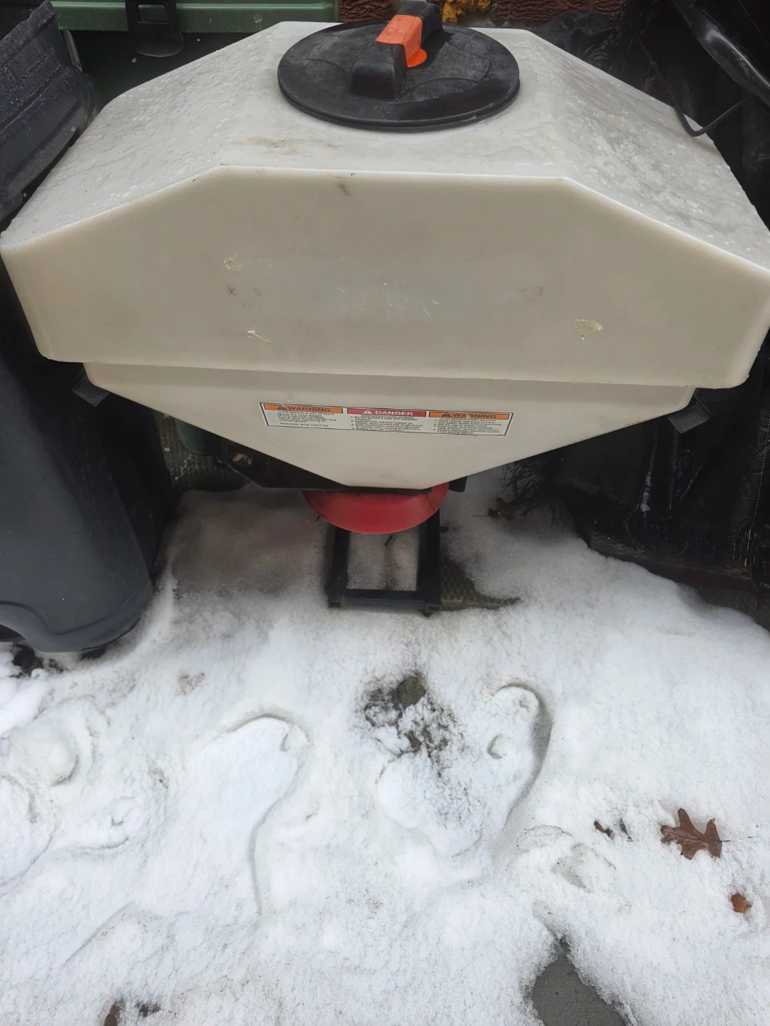 Tailgate salt spreader. Attaches to your vehicle by hitch. It's made of durable plastic. Tailgate salt spreader has a capacity of approximately 300 lbs. Brand new motor.