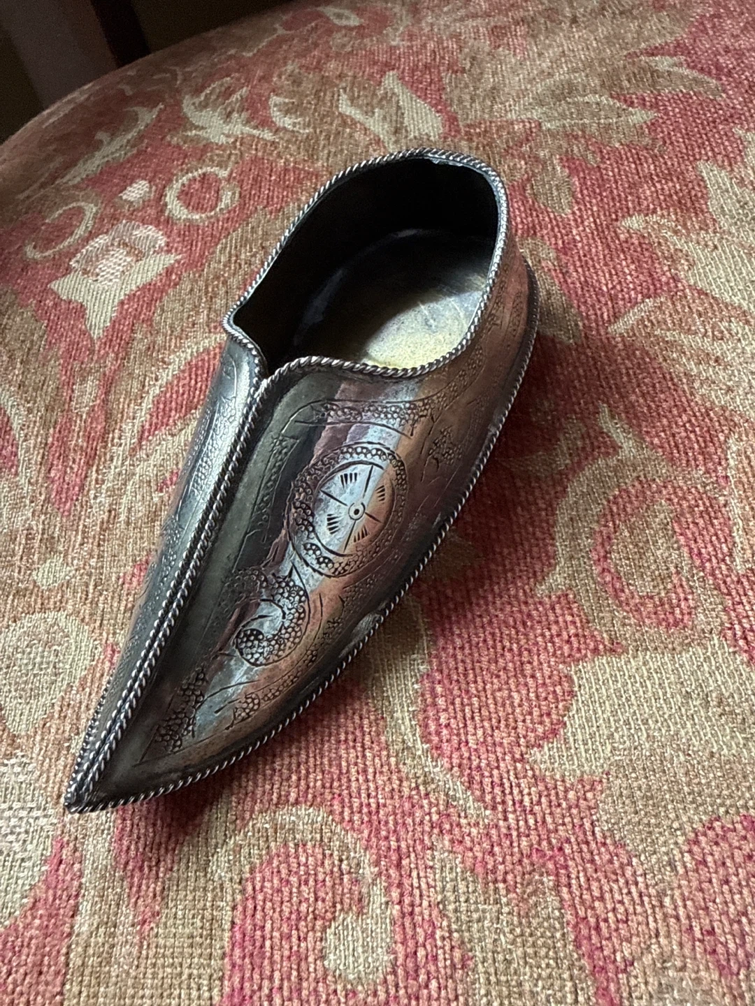 with intricate engraved patterns along the side and a braided trim. It's silver-toned metal and has a pointed toe design.