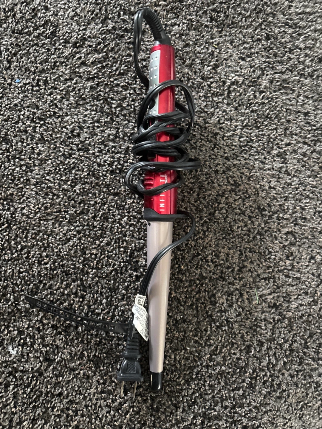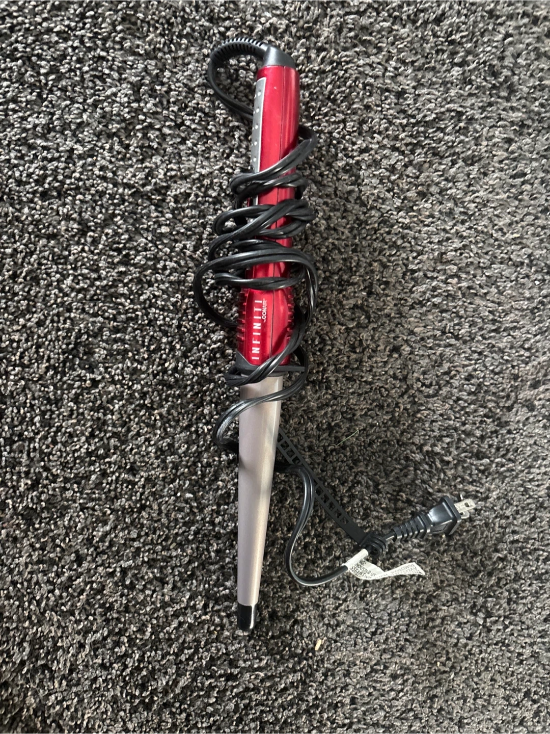 InfinitiPro by Conair curling wand in red and silver. Ceramic barrel for smooth styling. Cord wraps for storage. It's a tapered wand for various curl sizes.