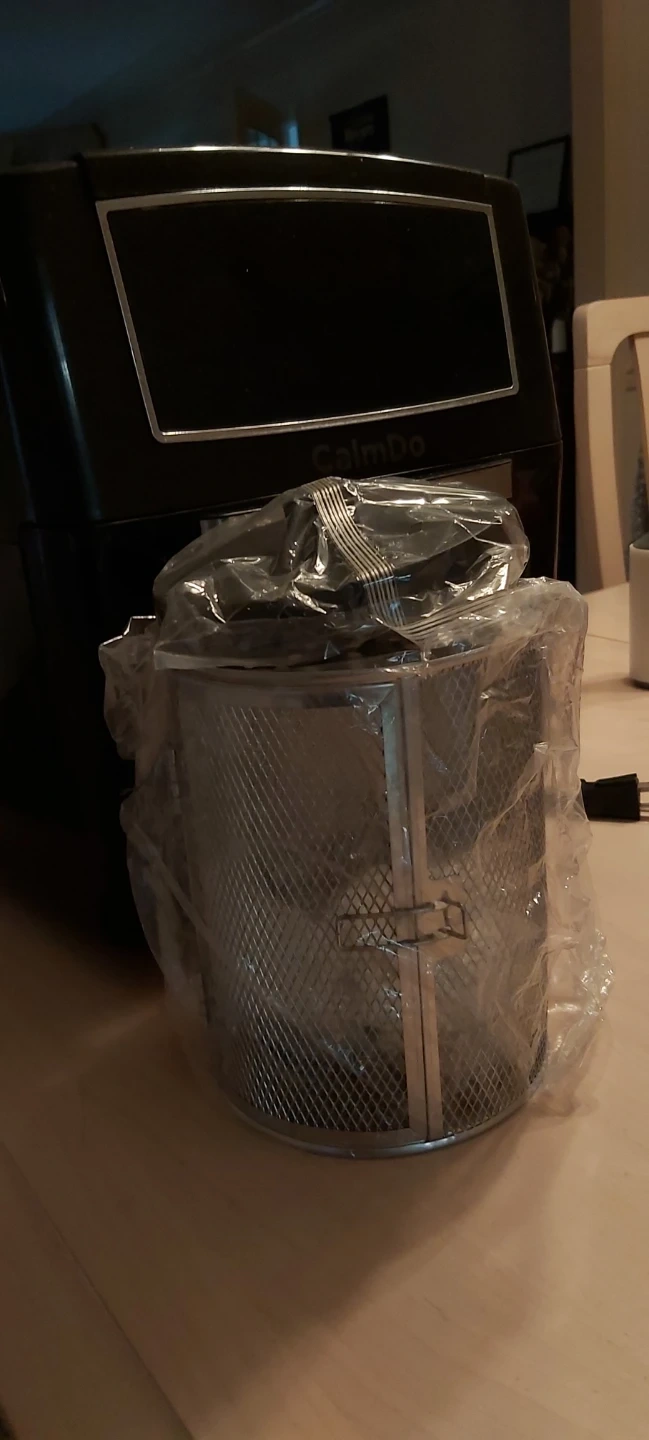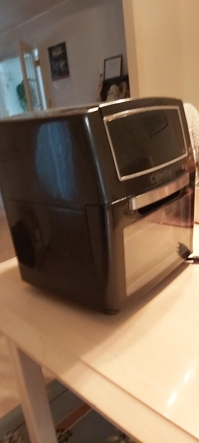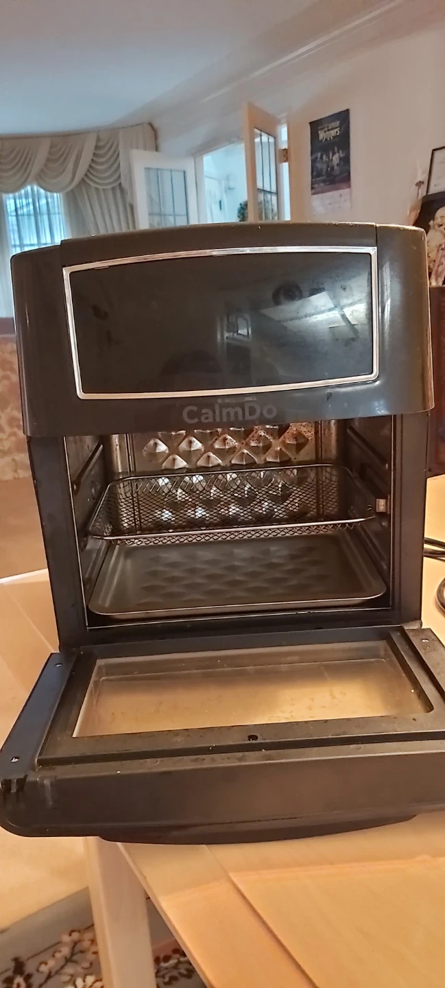 This is a CalmDo air fryer oven. It includes a rotisserie basket. It has multiple cooking functions. LED touch screen, reliable performance. 360mmx325mmx325mm