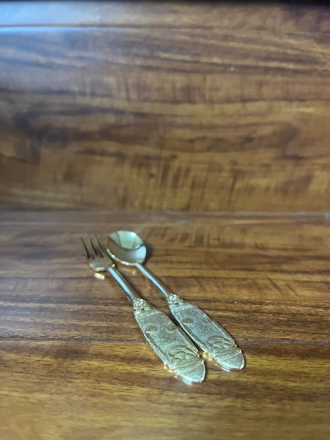 This is a gold-plated spoon and fork set from Hanbit. The handles have a decorative embossed design. It's a unique set for dessert or serving.