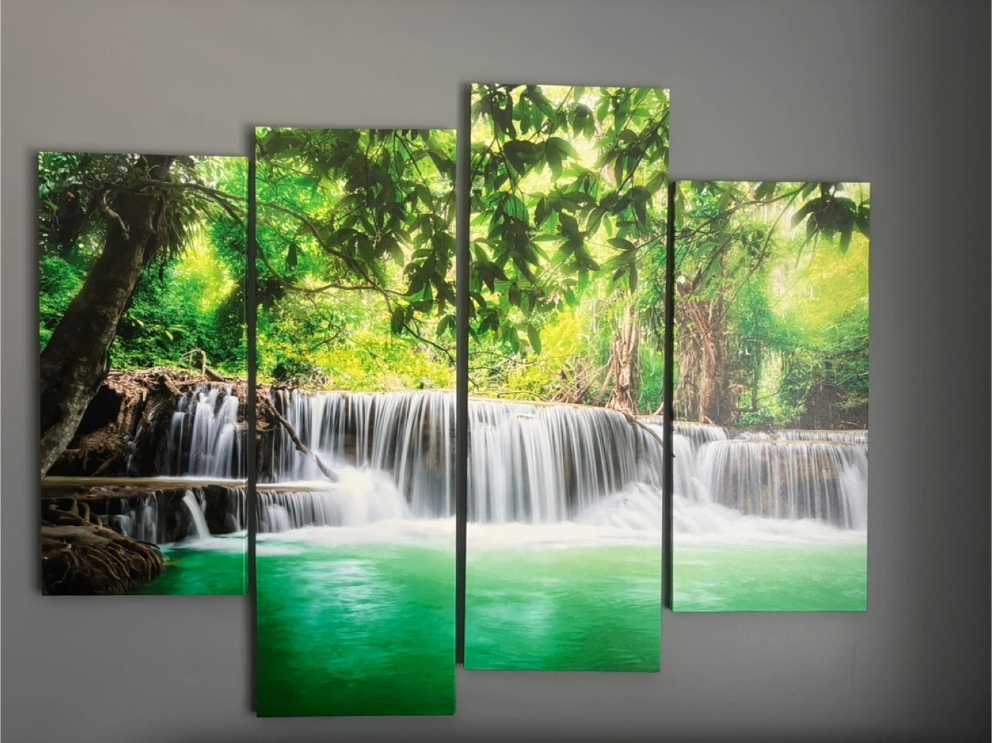 This set features a stunning four-panel canvas print depicting a lush green jungle waterfall scene. It's ready to hang and will bring a vibrant natural element to any room.