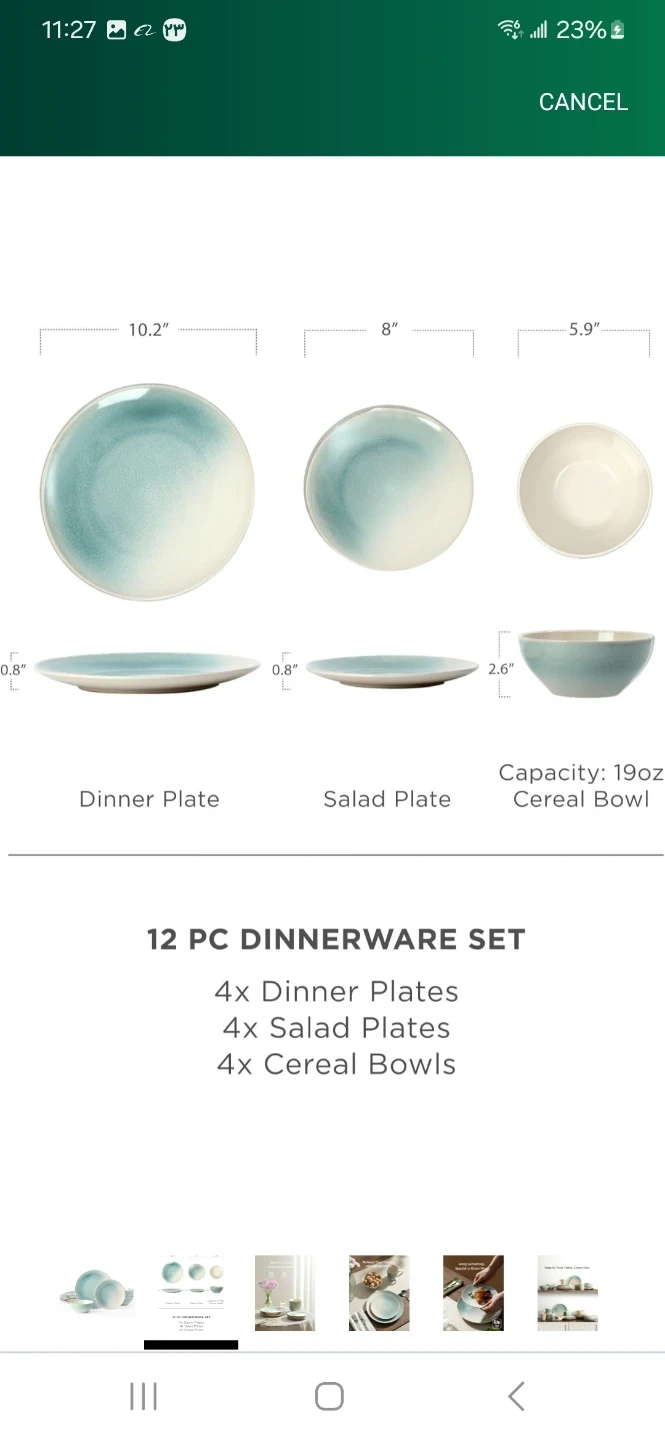 This 12-piece dinnerware set includes 4 dinner plates, 4 salad plates, and 4 cereal bowls. The cereal bowls have a 19oz capacity. Dinner plates measure 10.2 inches, salad plates are 8 inches, and bowls are 5.9 inches. It's a lovely set for everyday meals or entertaining!