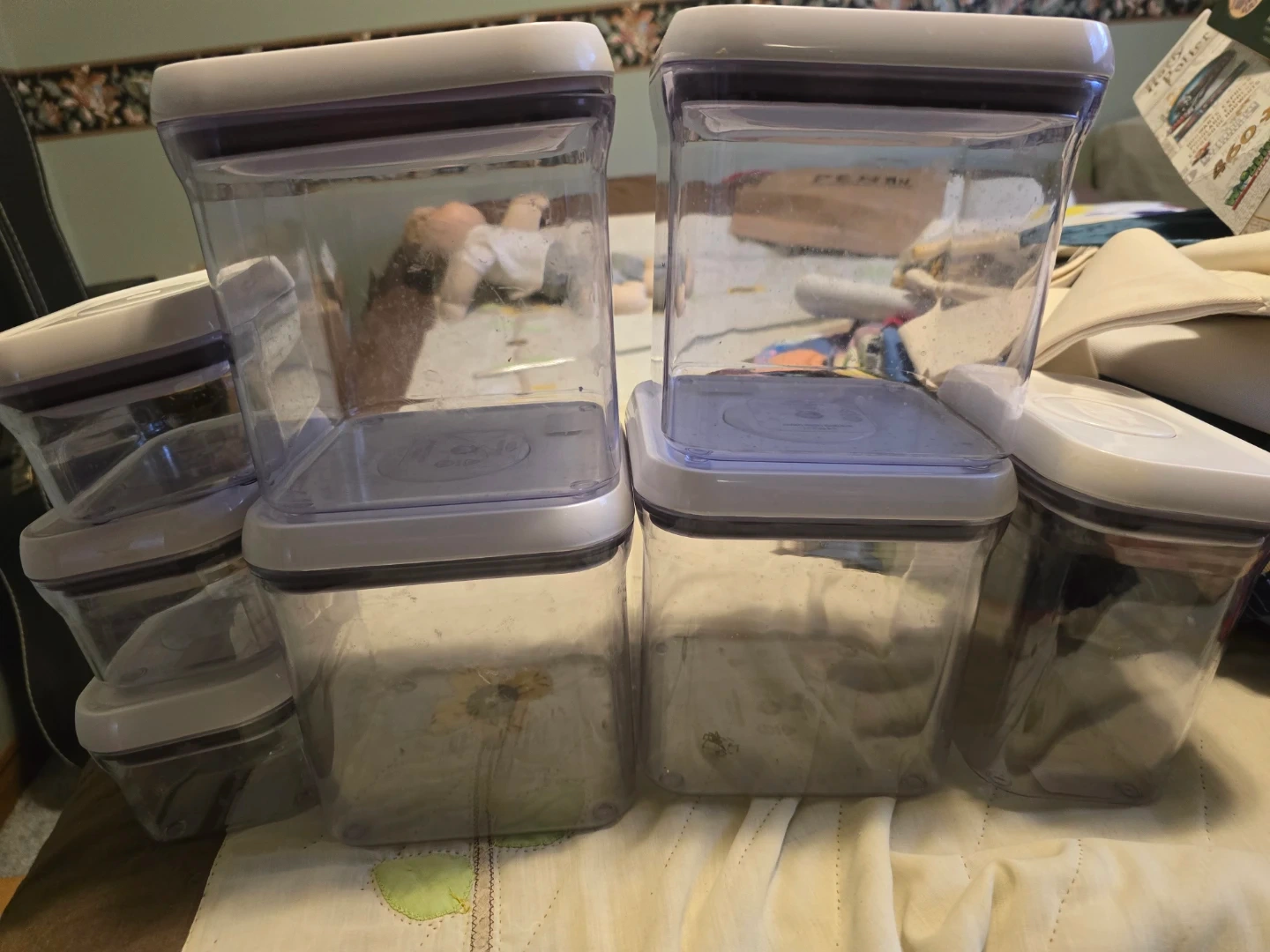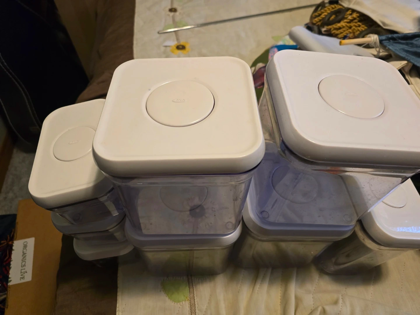 Set of OXO POP food storage containers. Includes various sizes for pantry organization. Containers feature airtight seals and stackable design. Made from durable plastic.