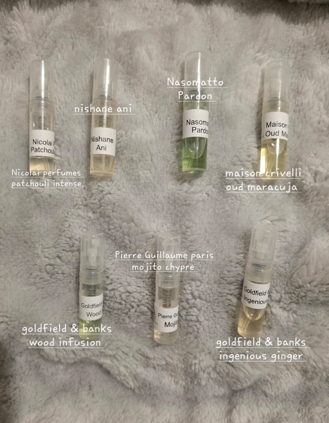 Includes various niche perfume samples from different brands and scents. Try out Nicolai Patchouli Intense, Nishane Ani, Nasomatto Pardon, Maison Crivelli Oud Maracuja, Pierre Guillaume Mojito Chypre, Goldfield & Banks Wood Infusion, and Goldfield & Banks Ingenious Ginger. These are all small spray samples.