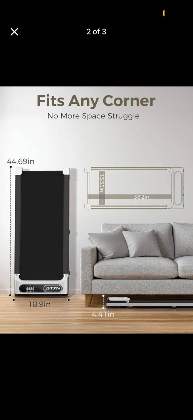 This compact treadmill is designed for walking while you work. It's slim and fits under desks or in small spaces. Dimensions are 44.69in long, 18.9in wide, and 4.41in tall. The running surface is 38.2in by 15.55in.