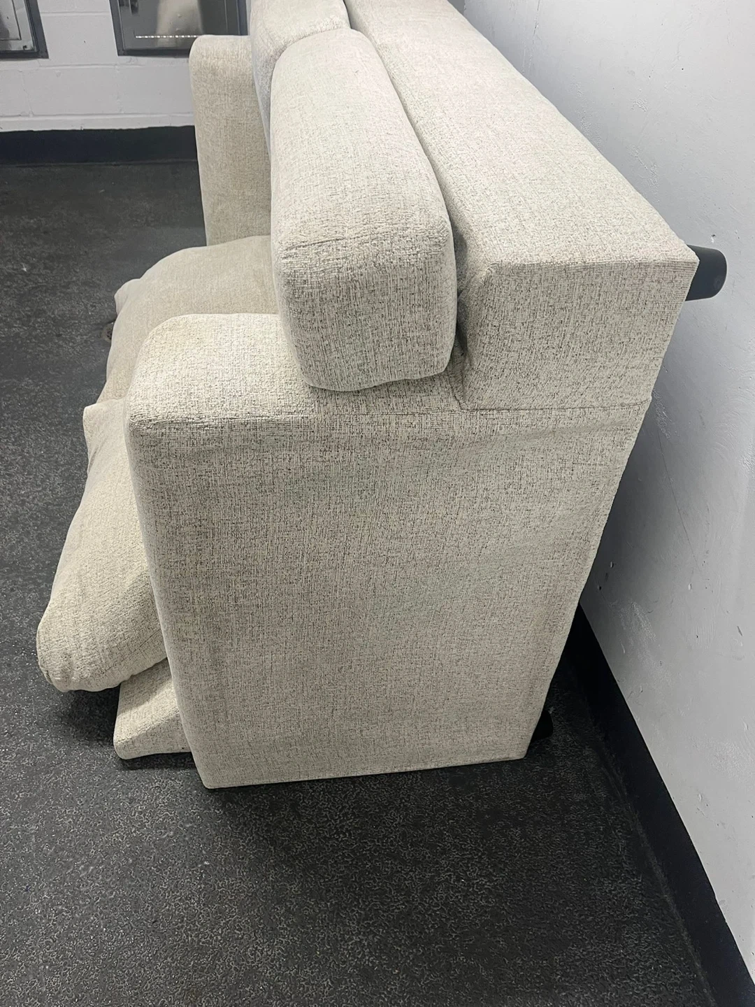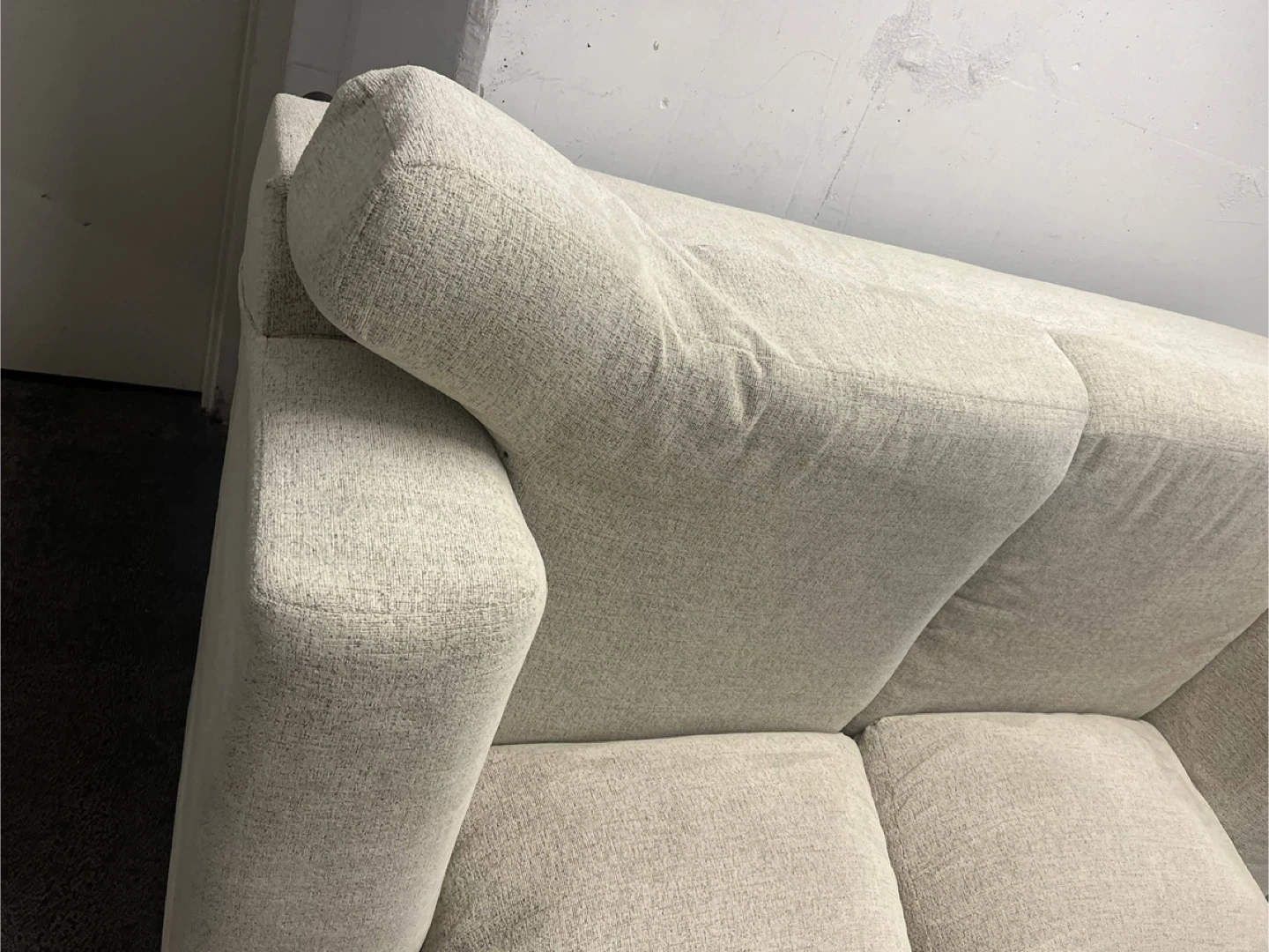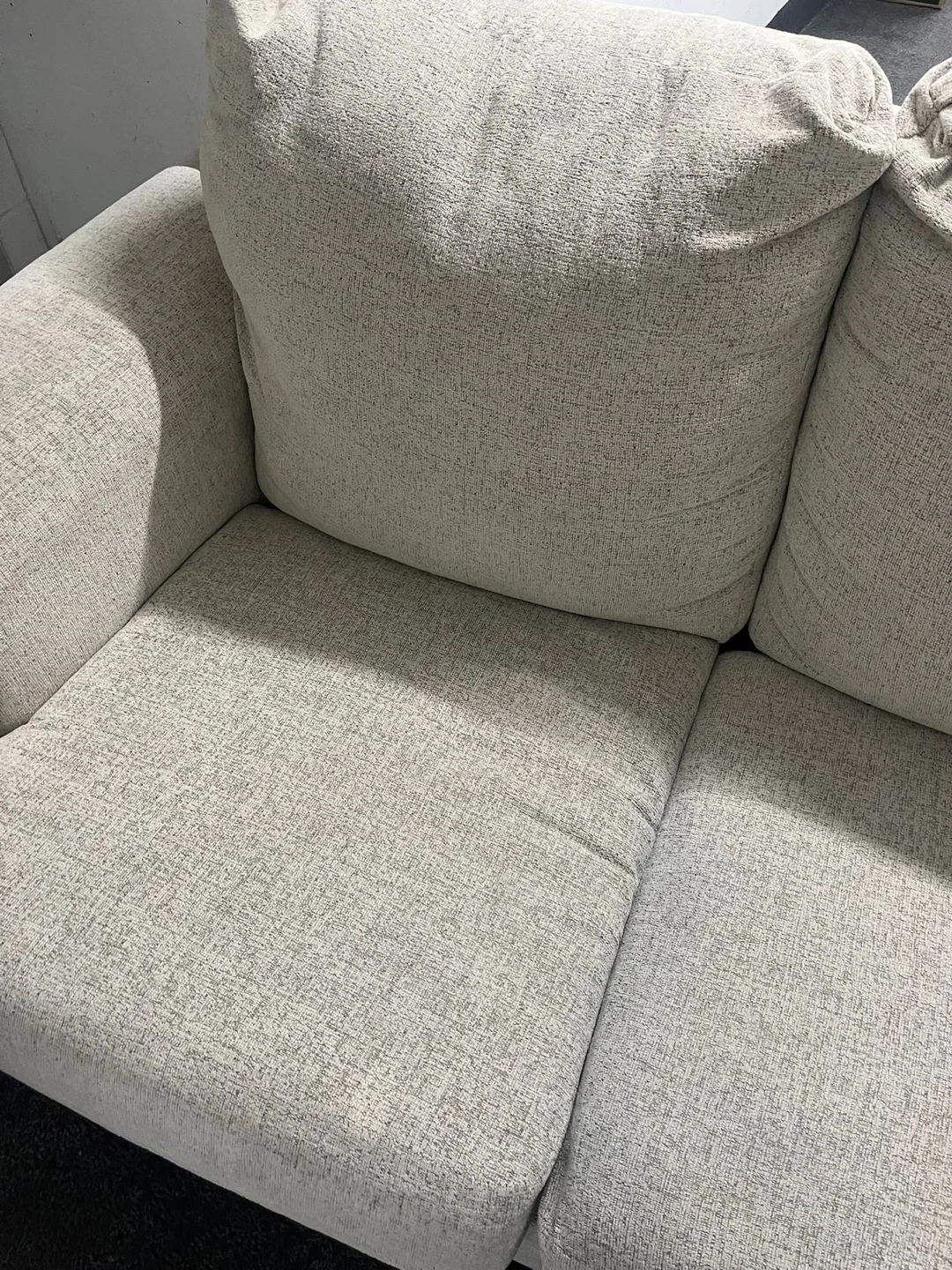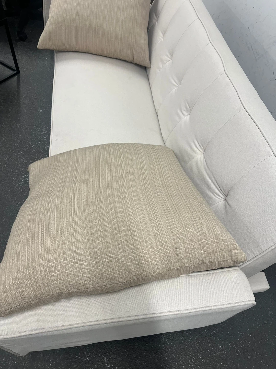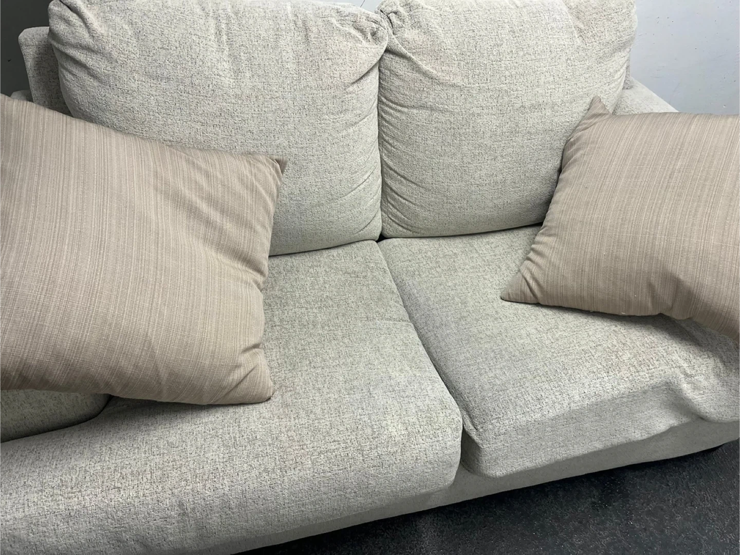 This beige loveseat sofa features a tufted backrest and comes with two decorative cushions. Its neutral colour makes it a versatile addition to any living space. The fabric appears to be a durable, textured weave.