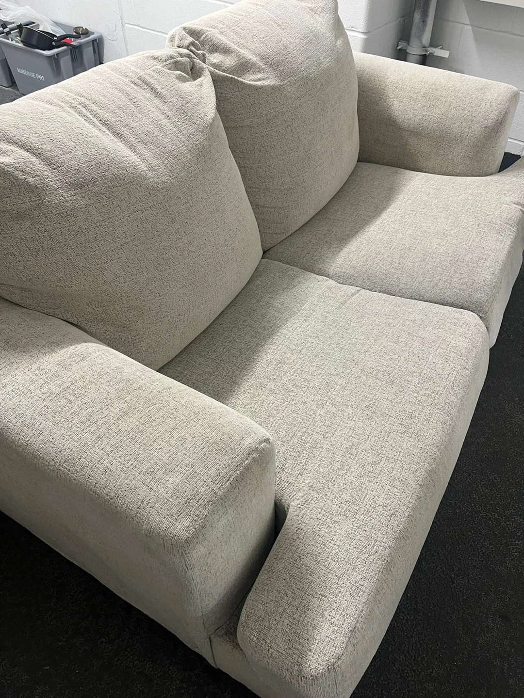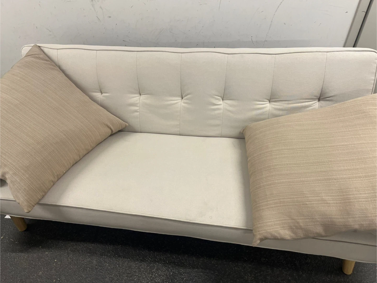 This beige loveseat sofa features a tufted backrest and comes with two decorative cushions. Its neutral colour makes it a versatile addition to any living space. The fabric appears to be a durable, textured weave.