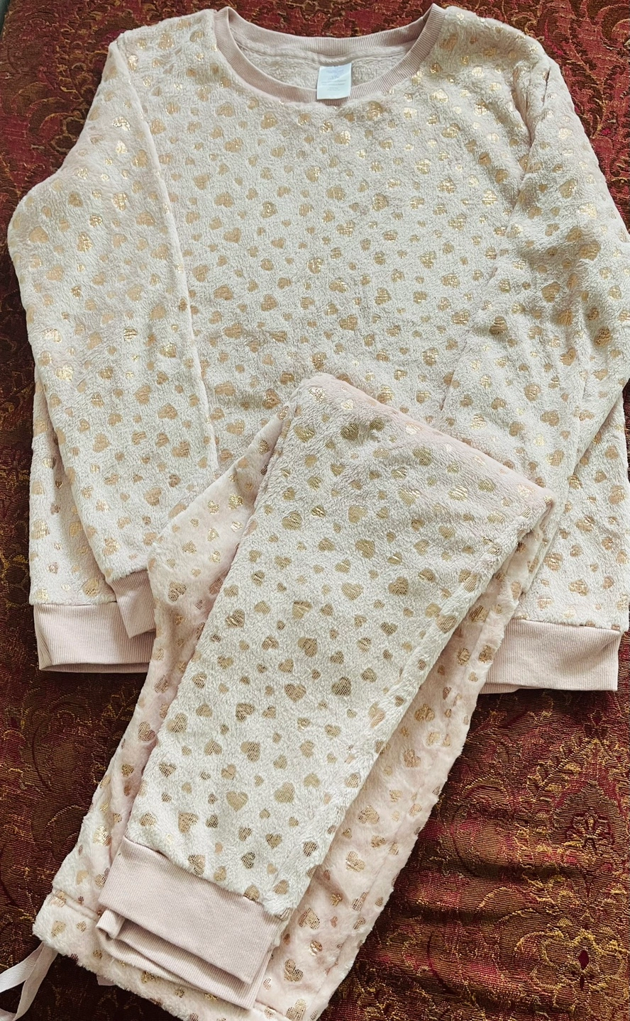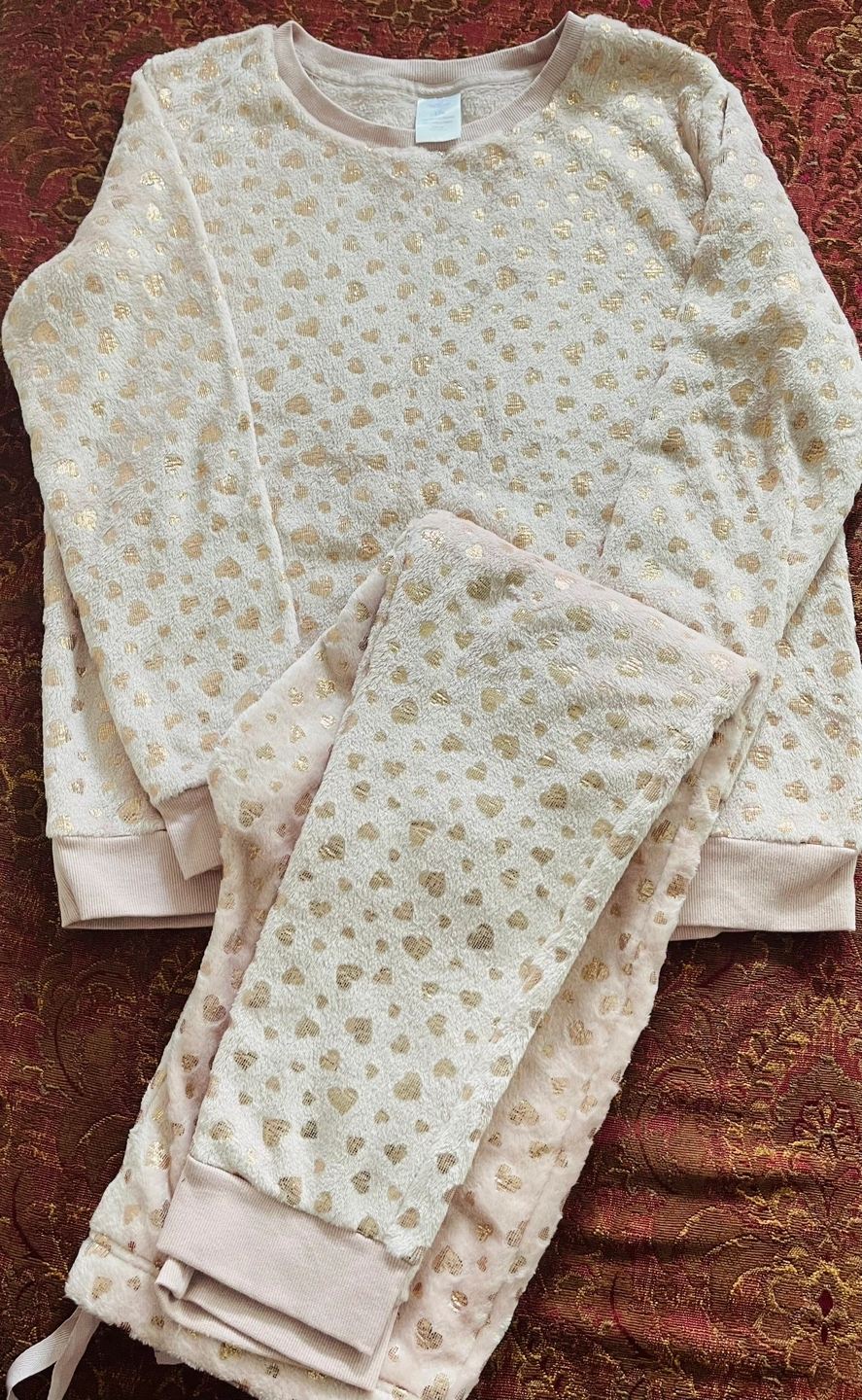 Soft and cozy pajama set with a pink base and gold heart print. Long sleeve top and long pants.