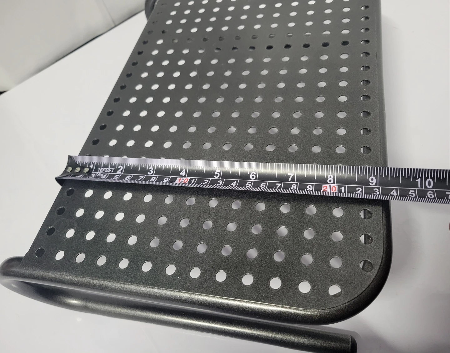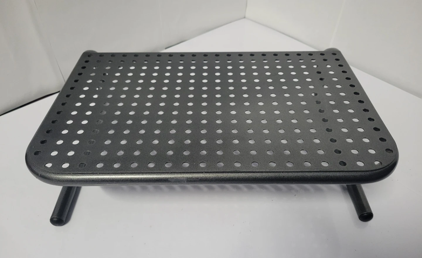 This metal monitor or laptop stand riser provides an elevated platform for your monitor. It's made of durable metal with a perforated top. The stand measures approximately 14.5 inches long, 9.25 inches wide and 4 inches high.
