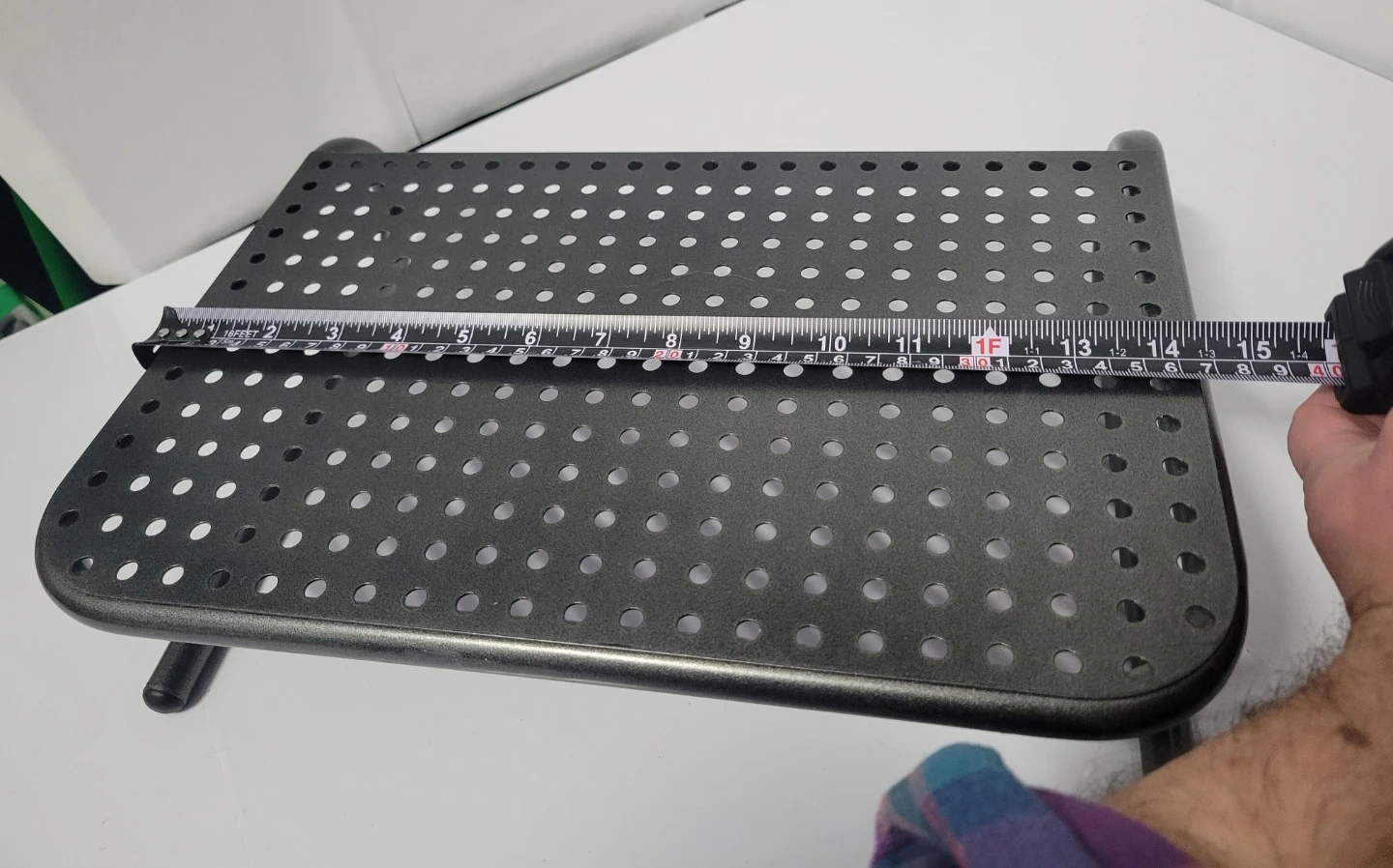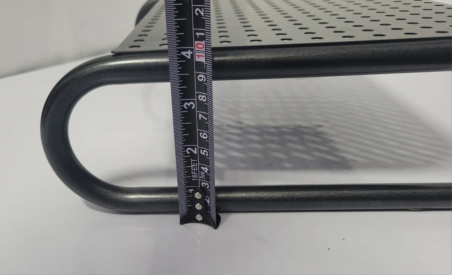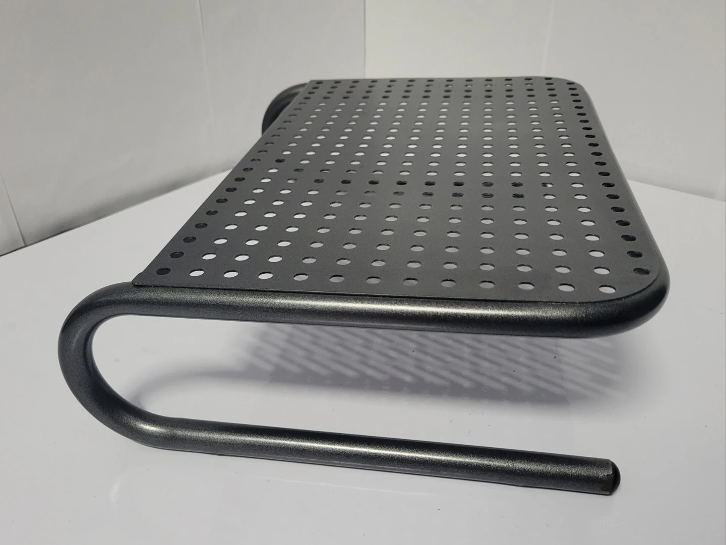 This metal monitor or laptop stand riser provides an elevated platform for your monitor. It's made of durable metal with a perforated top. The stand measures approximately 14.5 inches long, 9.25 inches wide and 4 inches high.
