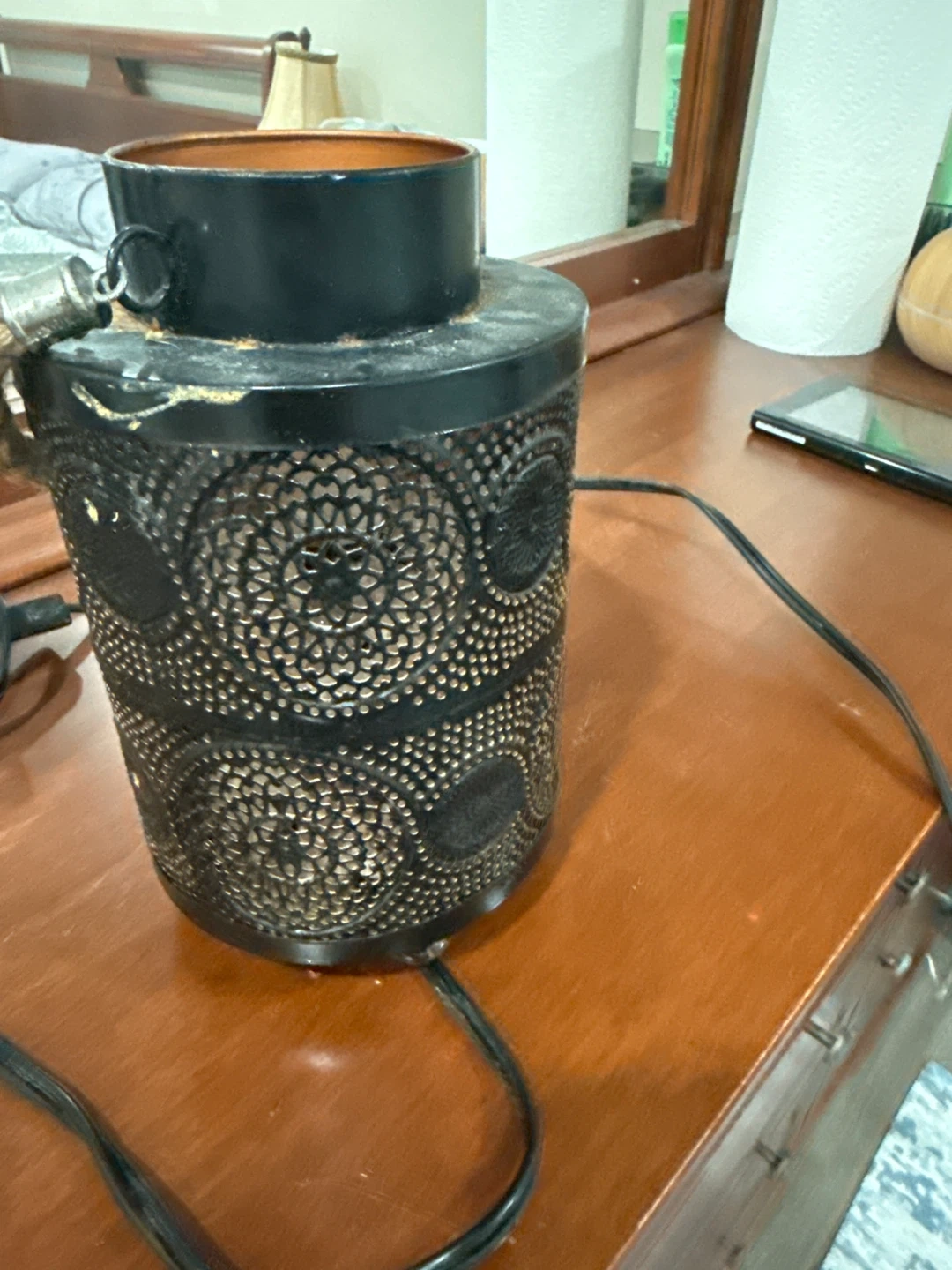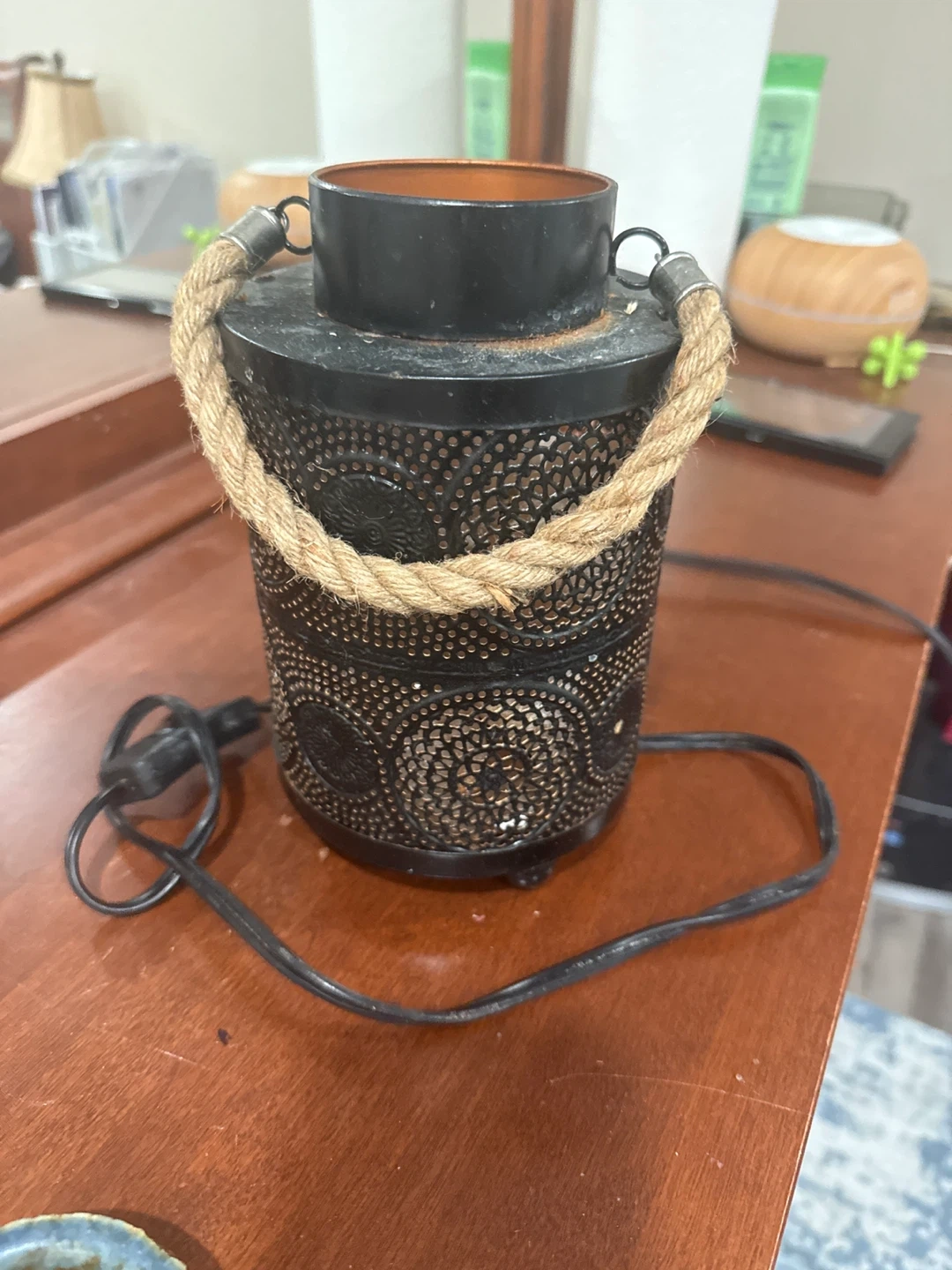 Decorative lantern style tealight holder filled with natural Himalayan salt chunks and small pebbles. It features a rustic black metal finish with intricate cut-out patterns and a rope handle detail. Perfect for creating a warm, ambient glow in any room!