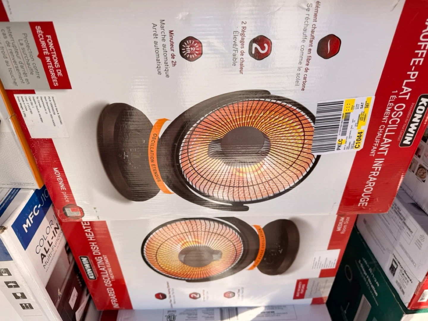 This Konwin oscillating dish heater features a 2-hour timer with automatic shut-off. It has two heat settings: high and low. This heater has extended oscillation and built-in safety functions like overheat protection and a tip-over shut-off switch. It's suitable for medium room sizes.