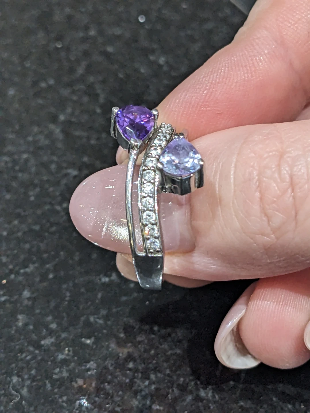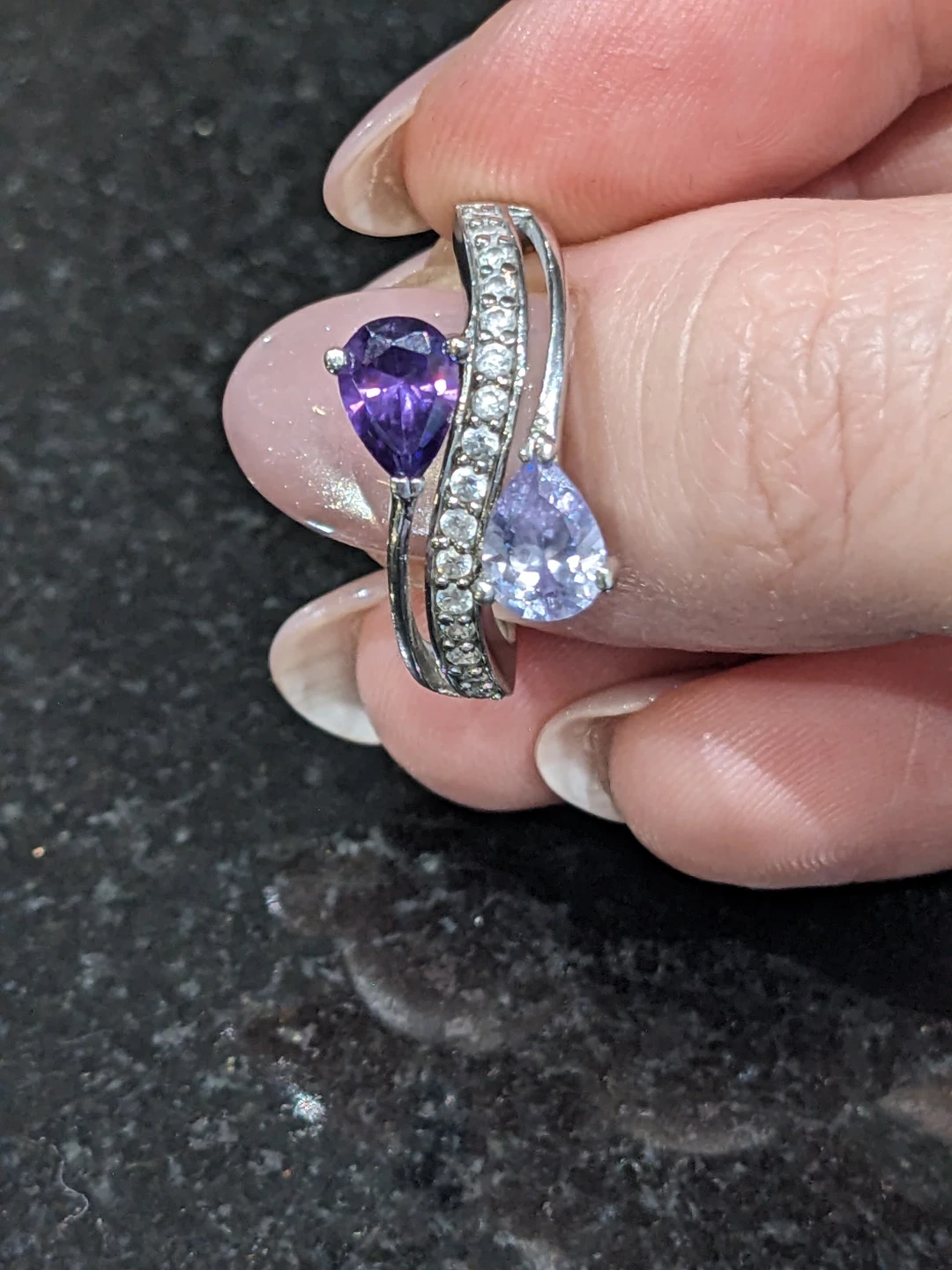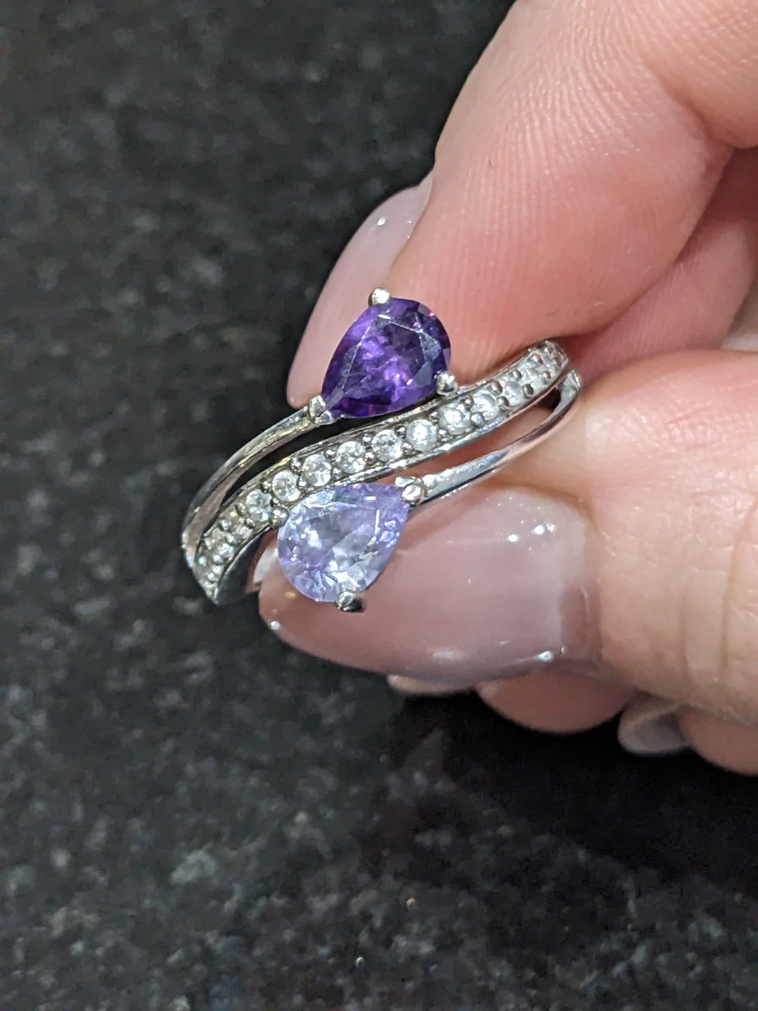 This ring features two pear-cut cubic zirconia, one deep purple amethyst and one lighter lavender gemstone, accented with small clear CZ stones. The band is crafted from sterling silver (stamped 925). The brand is Amor, and was purchased at Hudson's Bay. Some slight signs of use on the bottom part of the band (picture lighting makes it look worse than it is). Size 7.5.