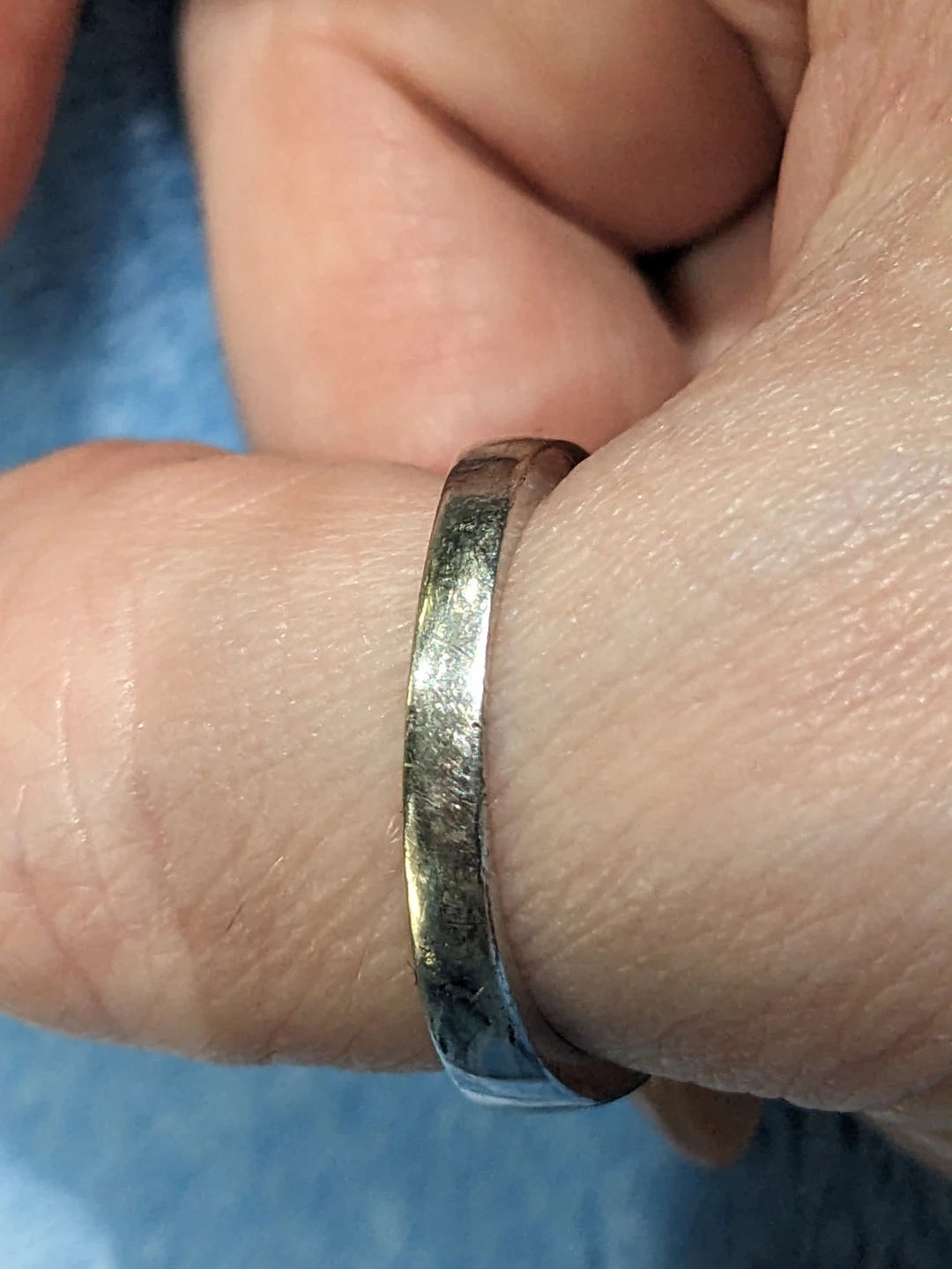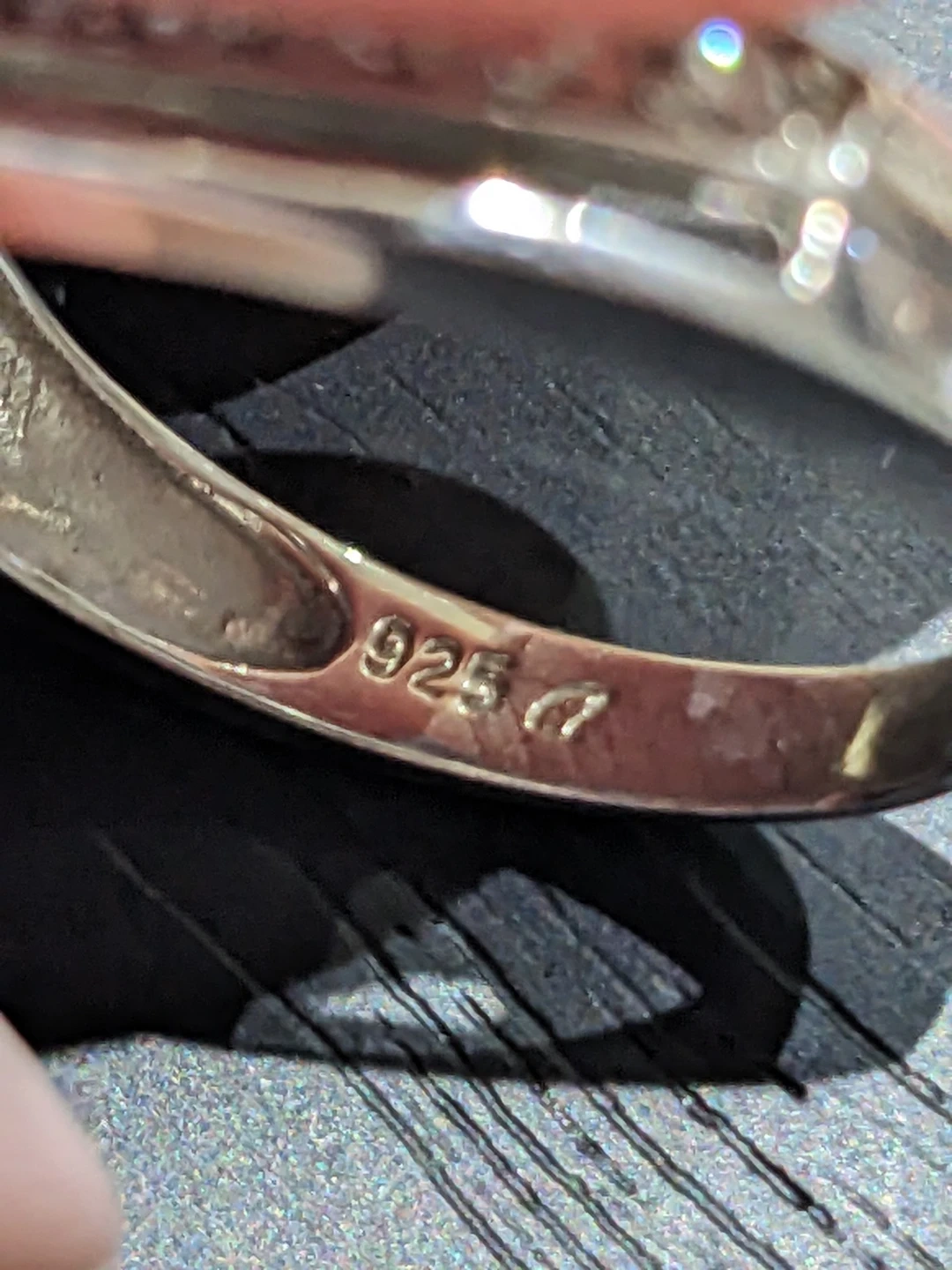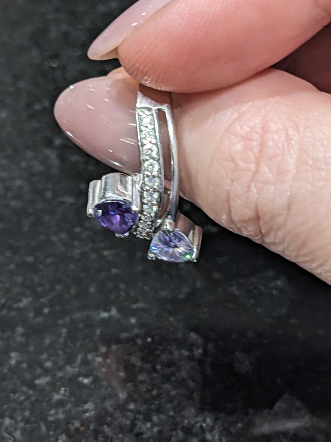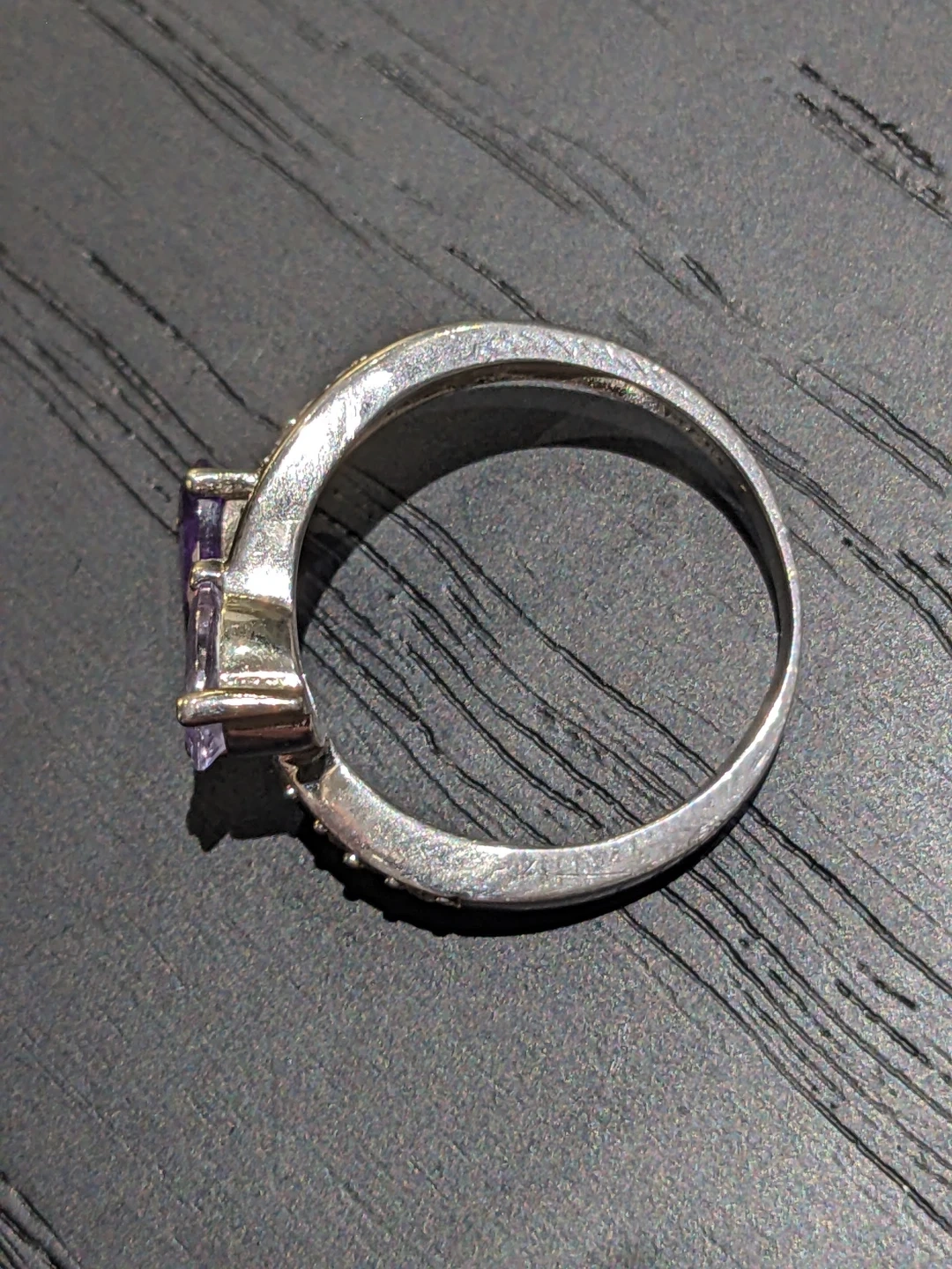 This ring features two pear-cut cubic zirconia, one deep purple amethyst and one lighter lavender gemstone, accented with small clear CZ stones. The band is crafted from sterling silver (stamped 925). The brand is Amor, and was purchased at Hudson's Bay. Some slight signs of use on the bottom part of the band (picture lighting makes it look worse than it is). Size 7.5.
