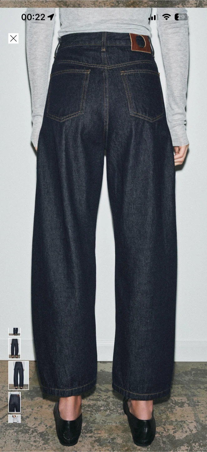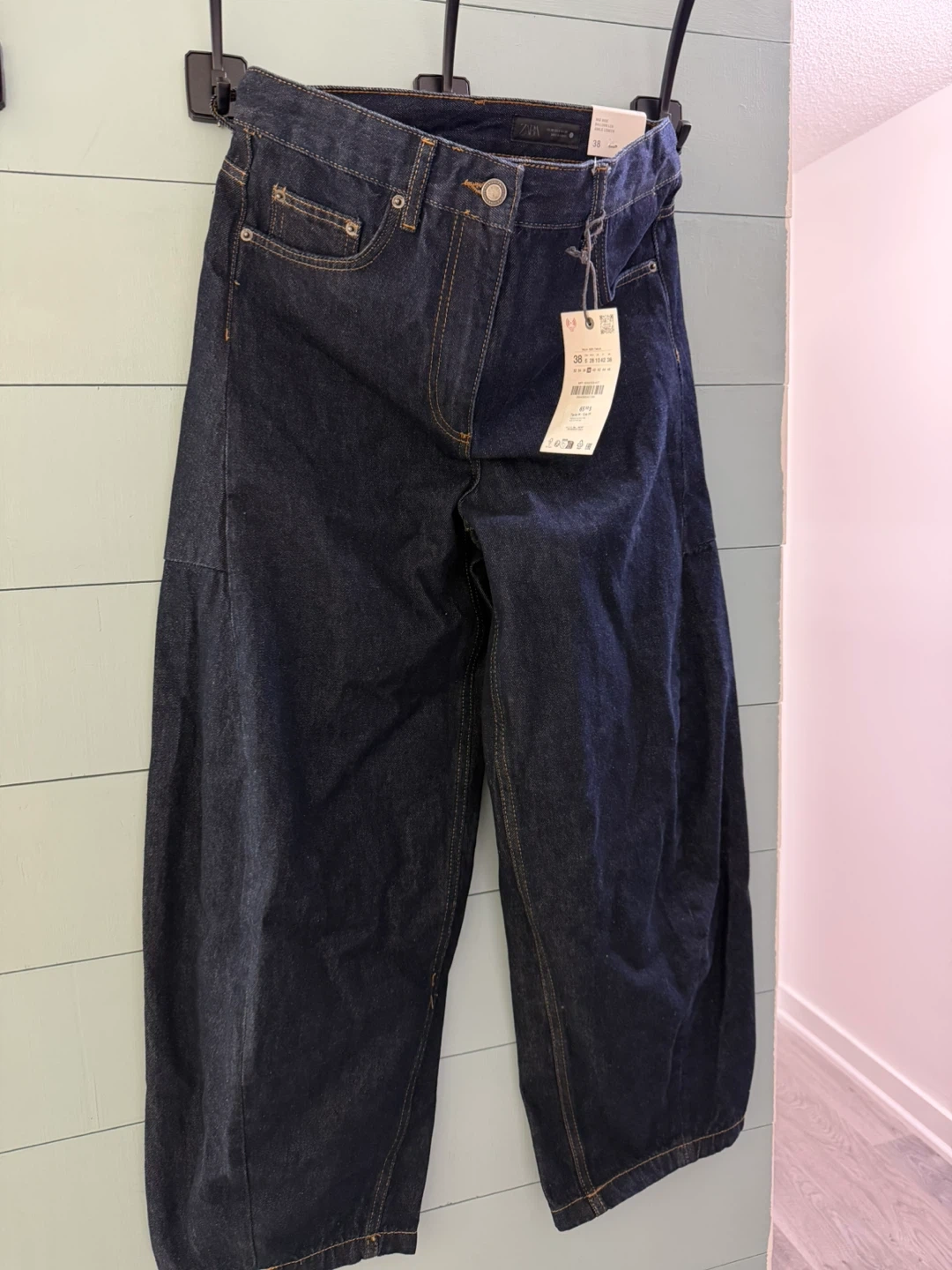 These are ZARA wide-leg jeans in a dark wash denim. The size is 38