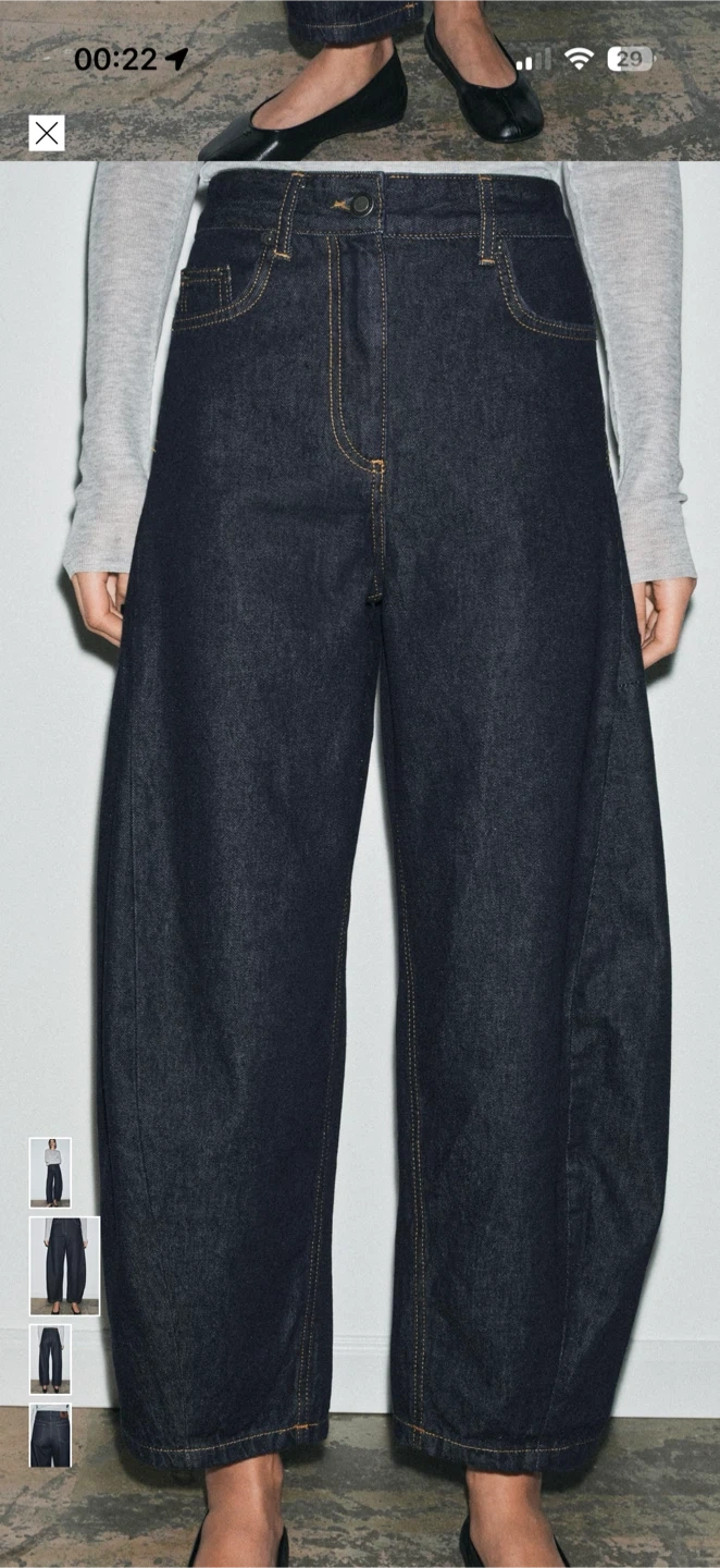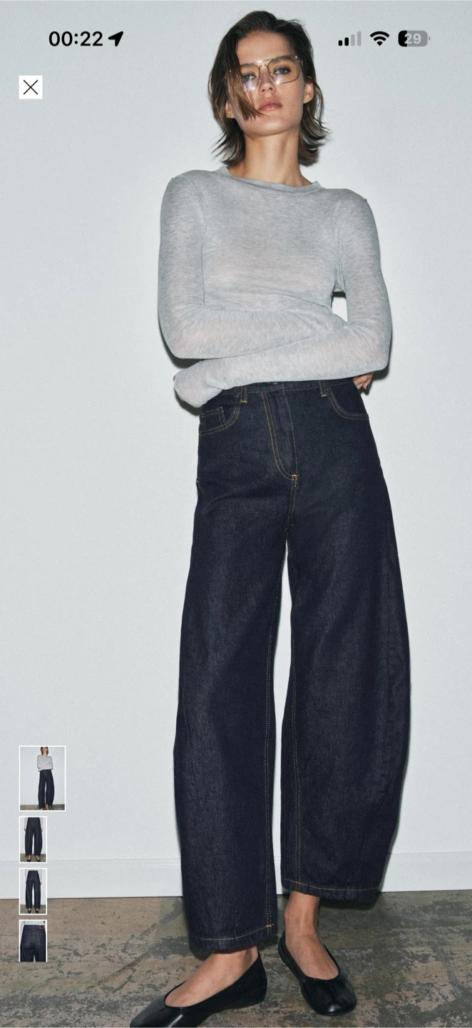 These are ZARA wide-leg jeans in a dark wash denim. The size is 38